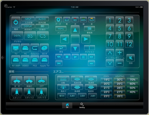このiRemoconの素晴らしいのは、iPhoneやiPadから操作できて、しかも赤外線の発光到達範囲が結構広いこと。値段が高いのが玉に傷だが、海外製のMaranzやPhilipsのホームシアター用の製品に比べたら可愛いもんだ。しかも、普通の学習リモコンでは学習が困難なエアコンの登録も難なく行なえる。 ![]() ![]() ![]()