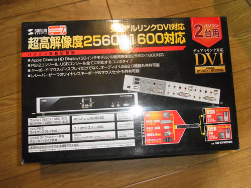 どうも、新しいDELLのモニタが思わしくない。MacとPCで切り替えたり、スリープから復帰すると、画面が出ないことがある。画面がくずれるような事もあって、これはKVMスイッチがいかれたかな・・ということで購入。ATENの新しいやつにしようかとも思ったが、ゲーミングマウス対応くらいしか進化がないので、6000円安い、旧モデルのサンワOEM品にする。しかし、結果的にはモニタの不良がKVMが原因ではなかった・・。 <13-04-13>