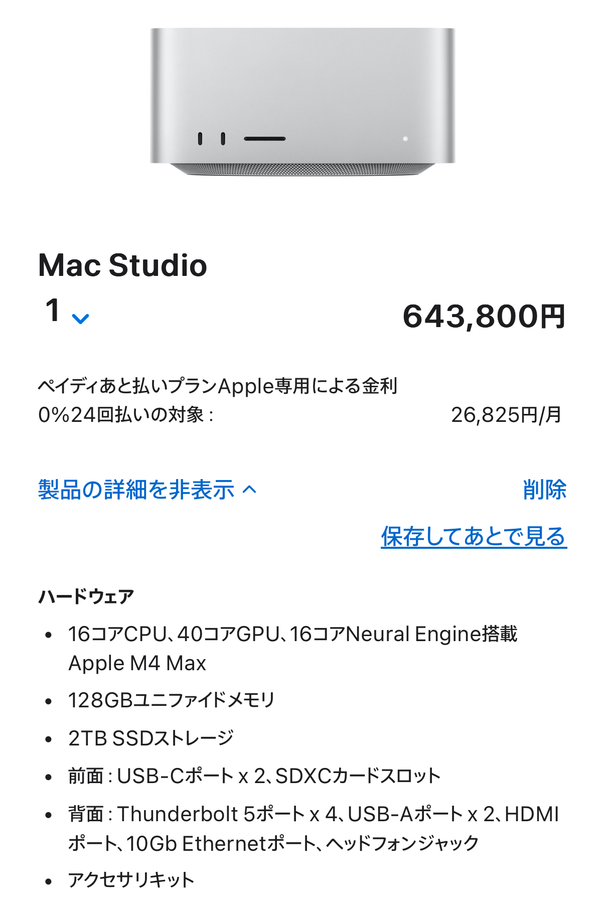 試しに、128GBメモリを選択し、ストレージを2TBにすると・・643,800円。高い!
