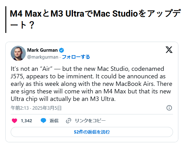 しかも、ガーマン氏のリーク通り、M4 MaxとM3 Ultraの2ラインナップだ!