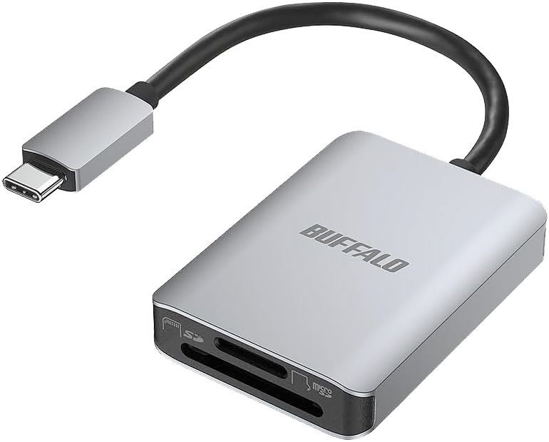 これまで使ってきたのはBuffaloのBSCRDSDU2WHで、今でも654円で売られている。SDカードスロットが二つあるのが特徴で特にトラブルもなく活躍したが、USB2.0対応でカードもSDXCカードまでしか対応しない。