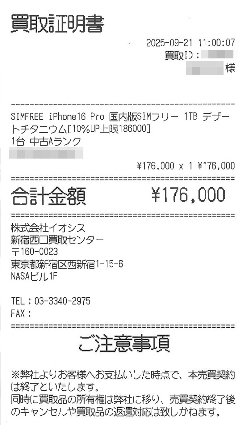 その後の動作確認も、ものの3分。現生176,000円を受け取り、11:00には店を後にした。