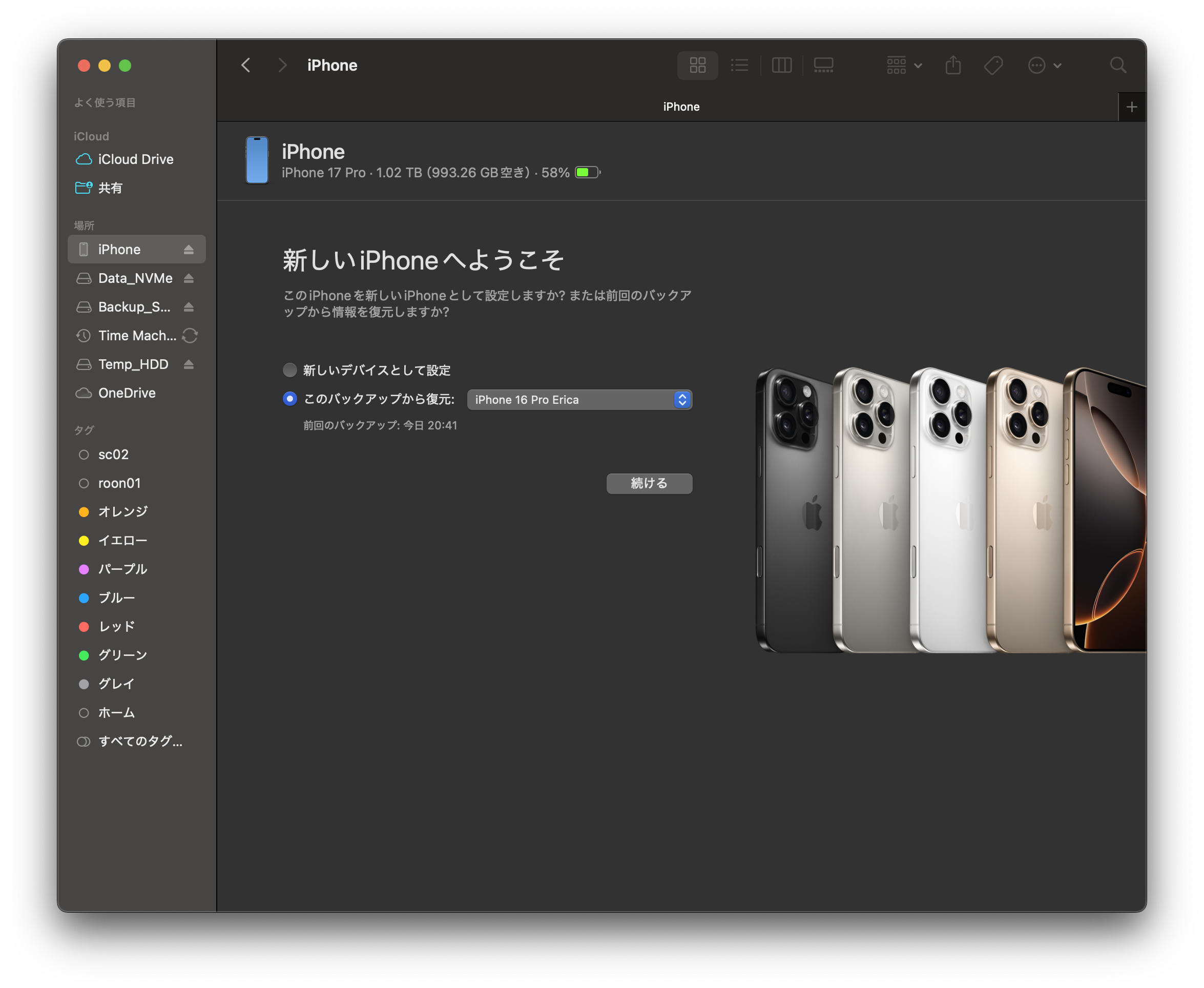再セットアップの過程でMacからの復元を選択し、Macと接続。バックアップデータからの復元を行う。