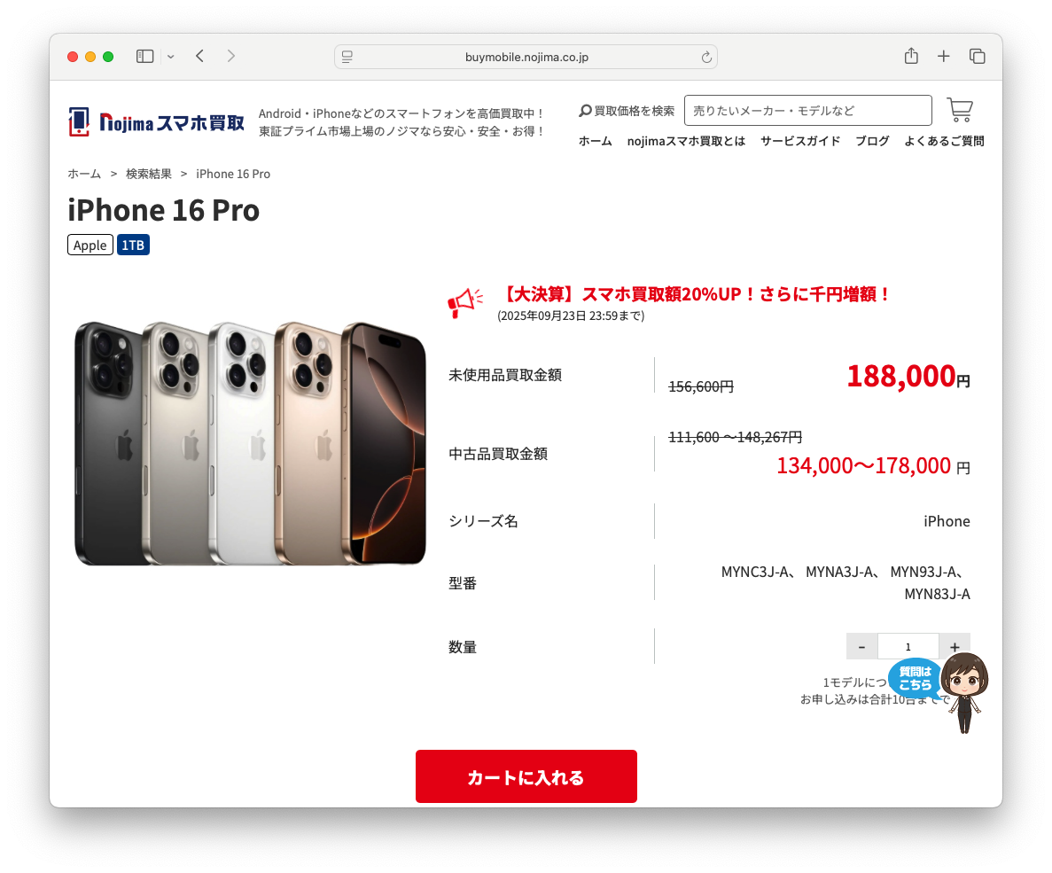 改めて他の業者の価格も比較すると、ヤマダも同じ166,000円、ゲオは安めの・・・、イオシスが高めで176,000と一番高額だった。
