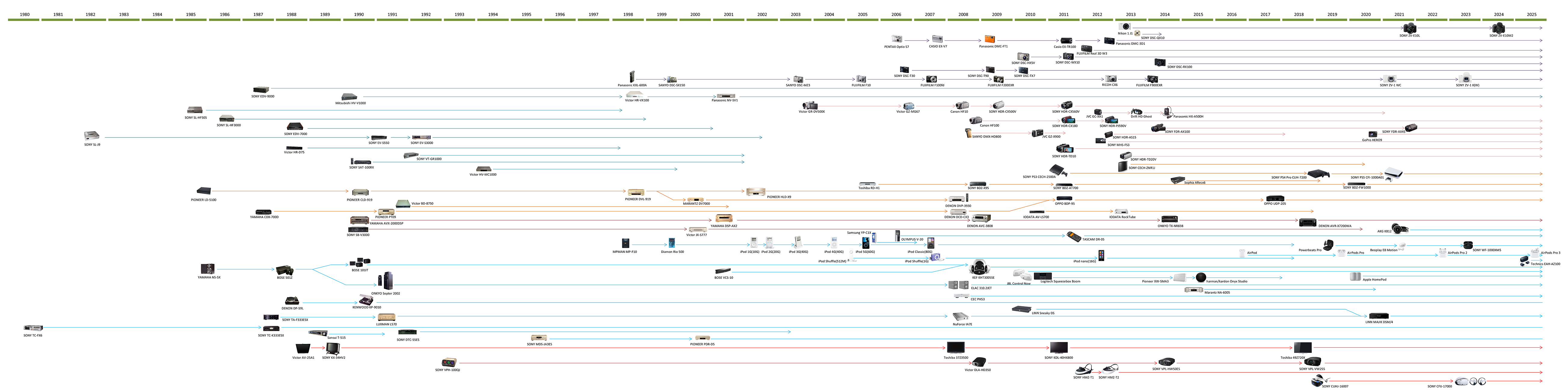はじめて買ってもらった単コン、SONY製TC-FX6からはじまり、現在に至るまでのオーディオ機器、ビデオ機器、カメラ等の購入の系譜を絵巻形式で。