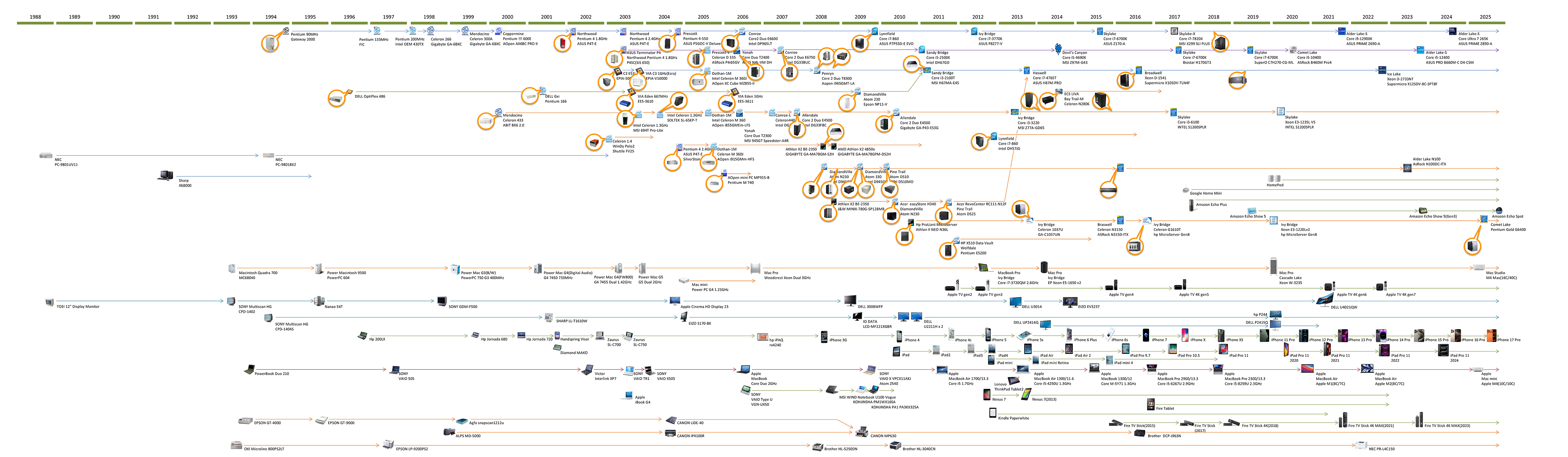 はじめて購入したPC98UV11からはじまり、現在に至るまでのPC、ディスプレイ、プリンタ等の導入機器の系譜を絵巻形式で。