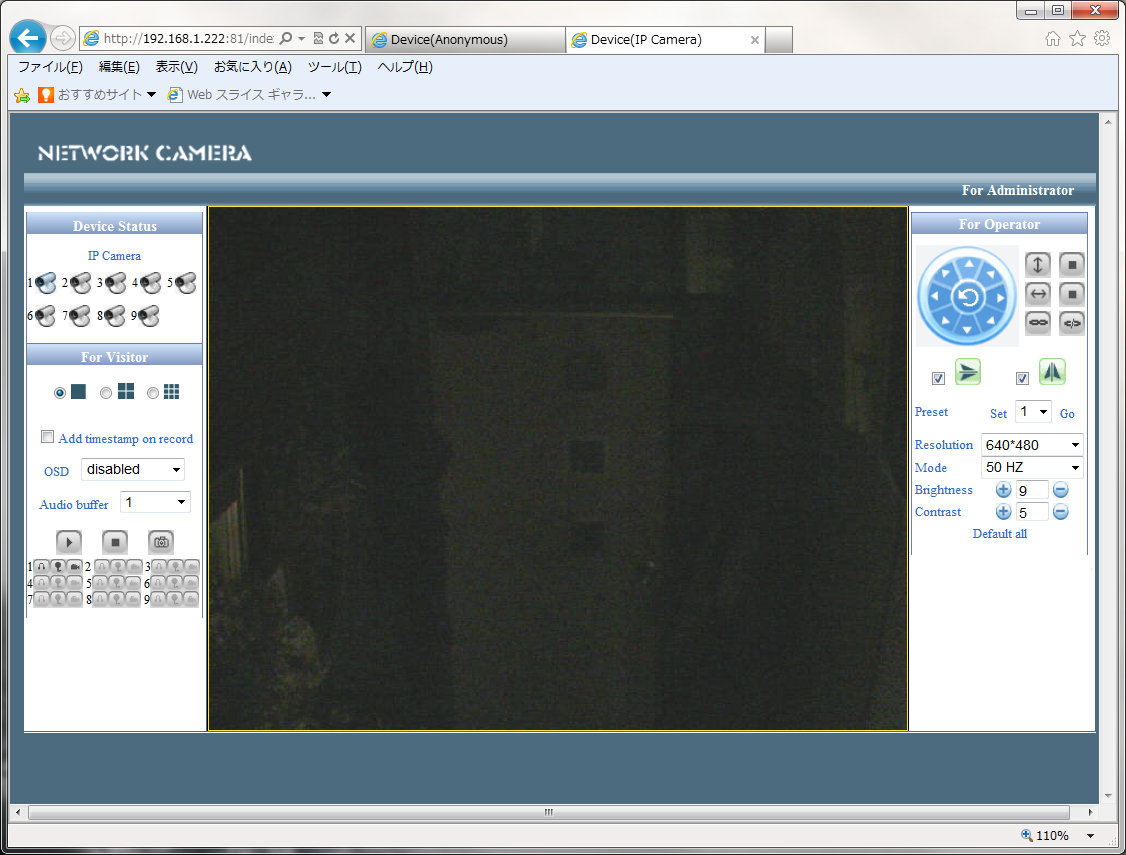 まずは、PCブラウザで視聴。TENVISとFOSCAMのカメラは、基本的な構成は一緒なのだが、レイアウトやデザインが微妙に異なる。TENVISの方が、本家FOSCAMにはない日本語UIがあったりするから不思議だ。