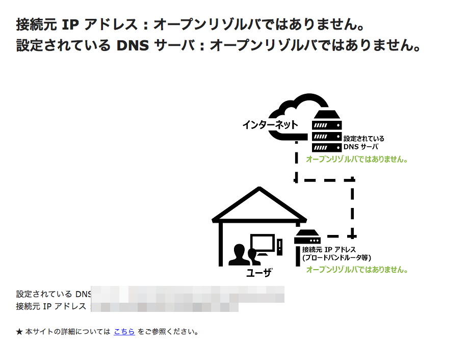 しかし、この設定にしてみたら、外部から当サイトにアクセスできなくなってしまった。原因は、ルータのポート塞ぎ。コンテンツサーバとキャッシュサーバがあって、前者は権威サーバと呼ばれ、自身のドメインのレコードの情報を管理する。後者は通常内部のDNSクライアントからの名前解決に利用される。ルータのポートを塞げ、という話は、後者のキャッシュサーバ運用を行う場合に、内部クライアントからの問い合わせにだけ応答させるために行うのであって、コンテンツサーバにこれを施したら、自身のドメインの名前解決ができなくなる。今回、ウチの場合は再帰設定を無効にしたことにより、キャッシュサーバの機能がなくなったので、ポートを塞ぐ必要はない。ということで、当サイトへのアクセスも可能で、オープンリゾルブ状態でもなくなった。