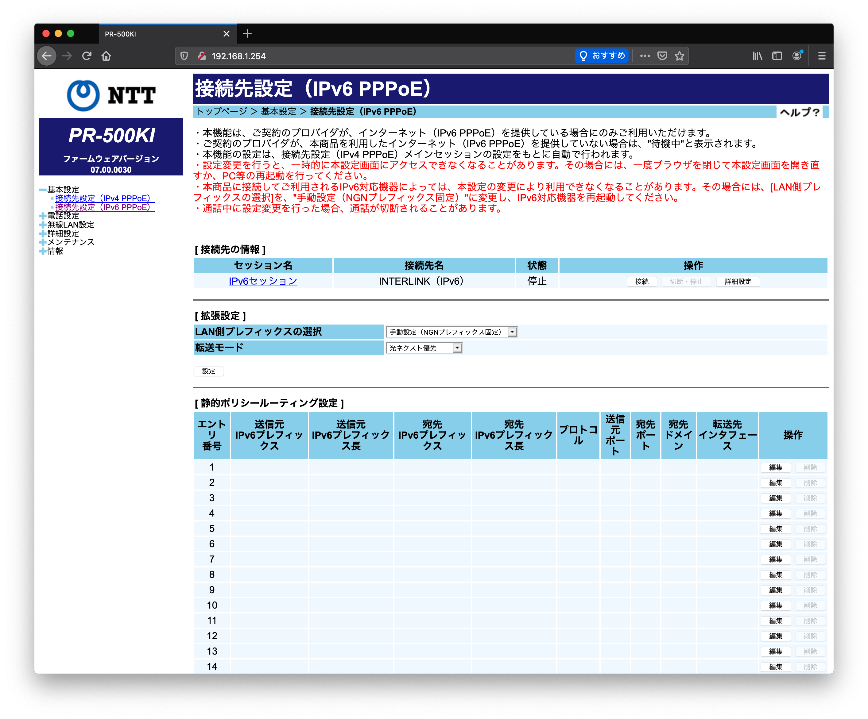 2段ルータ型にした際の、速度面の弊害なく、夜間の下りは大幅スピードupになっているが、日によって回線状況は結構変わるので、これが2段ルータの効用かは懐疑的だ。いずれにしても、PPPoEと比較すれば、夜間の速度向上は目覚ましいものがあるだろう。 余談だが、INTERLINKのFAQには、IPoE接続時の注意点がしっかりと明記されている。 「ZOOT NATIVE」(IPv6 IPoE接続)1契約でご利用いただけるポート数は1024となります。 利用するアプリケーションに左右されますが、おおよそ1端末が消費するポート数は200〜300となり、インターネットに接続している端末の合計で消費しているポート数が1024を超えると、ポート数不足に陥り回線が途切れる(読み込むのに時間がかかる)という事象が発生します。 インターネットに接続している端末が多い時間帯において、回線が切断する場合、接続する端末を減らして通信が安定するかご確認ください。 DS-Liteのポート数上限は1024だそうで、V6プラスは240だそうだ。 やはり、IPoE接続のみの環境に完全移行するのは問題がありそうだ。 ただ、以前検討した固定IP付きのV6プラスサービスであれば、この部分は解消されるように思えるのだが、どうなのだろうか。 HGWのLAN側プレフィックス設定を手動にしてみたが、夜になって帰宅したところ、やはりインターネット接続ができなくなっていた。 仕方なく、その次の手段となる、IPoE用のヤマハルータの配置位置をHGWの配下に変更する。 ![]() まだテスト段階なので、試験的に仮ケーブルで配線するだけだ。 HGWの空きのLAN側ポートと、ヤマハルータのWAN側となるLAN2ポートを直結するだけ。何も設定せずにこんな接続で本当に通信できるのか懐疑的だったのだが、結果的にはルータの再起動などをしなくてもインターネット接続ができるようになった。 まだ暫く様子見は必要だろう。 それにしても、今一つ納得いかないのは、何故この直列接続で通信できるのか、だ。HGWの設定を見直し、何か関係する設定がないか見直すが、PPPoEブリッジが有効になっているくらいで、他に関連しそうな部分は見当たらない。PPPoEブリッジは関係ないような気がするのだが・・。直列の接続が逆なら理解できる。IPv6ブリッジや、IPoEパススルーといった設定項目は存在しない。HGWのヘルプをみると、IPv6ブリッジ機能はあるようなのだが、その設定は、"Bフレッツを利用する場合に表示される"、と書かれている。NGN網を使用するフレッツ光ネクストでこの設定が非表示になるということは、特に設定しなくてもブリッジされる、ということなのだろうか? インターネット上を検索すると、関連するようなサイトを見つける。 https://note.com/symmetrybreaking/n/ne6453885c798 ここでは、当初の並列ルータ接続で起きた、暫くすると接続ができなくなる症状と同じようなケースが報告されている。名前解決ができなくなる、と書かれていて、PPPoE接続しているルータの、IPv6ブリッジとPPPoEブリッジを無効にしたら通信が安定した、となっている。 https://noma-jp.com/media/ipv4pppoe-ipv6ipoe/ ここではホームゲートウェイとIPoEルータの直列接続について記載されている。やはり特別な設定をしなくとも、IPoEルータのWAN側とホームゲートウェイのLAN側を繋げれば良いようだ。 結果オーライではあるが、仕組みを理解できないと、何だか気持ちが悪い。もう少し勉強してみよう。 うまくいったと思っていたIPoE接続だが、やはり時々おかしくなる。 特に何もしていないのに、気が付くと通信ができなくなっている時があるのだ。 configを改めて見直し、不要な部分(使えないVPN接続)を削除し、シェイプアップをする。しかし、状況はあまり変わらないようだ。 また、IPフィルターの設定をどのようにしたら良いのか、今一つ分からない。 IPv6のフィルターについては自動的に追加されているようで、多分問題ないのではないかと思うのだが、IPv4周りのフィルターが全くない。既存の設定は全て消えている。 調べると、tunnel設定のところでフィルターを設定している例があったので、過去のconfigも参考にして、同じように追加してみたが、結果、全く通信ができなくなってしまった。 この追加部分は削除。 これが、一応完成したconfig。 それにしても、はじめは繋がるのに、暫くすると繋がらないくなるのはおかしいな・・と疑問に思い、Webで検索すると、INTERLINKのFAQでそれらしい頁が見つかった。 ZOOT NATIVEの接続が1日数回、または約3時間おきに切れてしまいます というFAQで、それによると、 ホームゲートウェイのルーター側で「DHCPv6クライアント取得情報(IPoE)」機能が約3時間おきに動作します。その際、HUBと並列で繋がっているDS-Liteの接続も同時に切断されるためです。 と書かれている。 対処法としては、HUBを介してHGWとIPoEルータを並列で繋いでいる場合は、HGWの配下にIPoEルータをぶら下げろ、とある。 ![]() また、HGWのWebコンソールで、IPv6 PPPoE設定の、LAN側プレフィックスの選択を、自動設定から手動設定に変える
