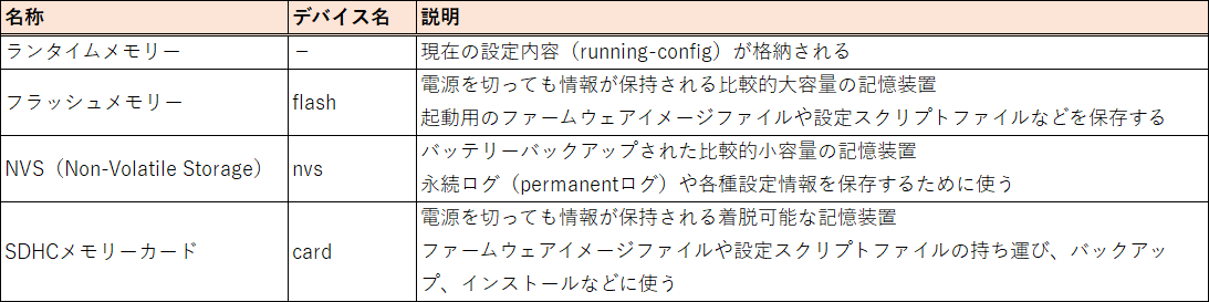 RAM上の現在の設定内容を[running-config]と呼ぶ。システムを再起動すると消えてしまうため、[startup-config]に書き出しを行う。
