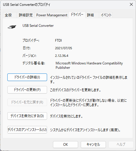 デバイスIDなどから調べると、ケーブルに内蔵されているUSB-シリアルデバイスはFTDI製のようで(そもそもAmazonの製品説明でもそうなっていた)、WebサイトにはWindows 11対応のドライバも公開されている。