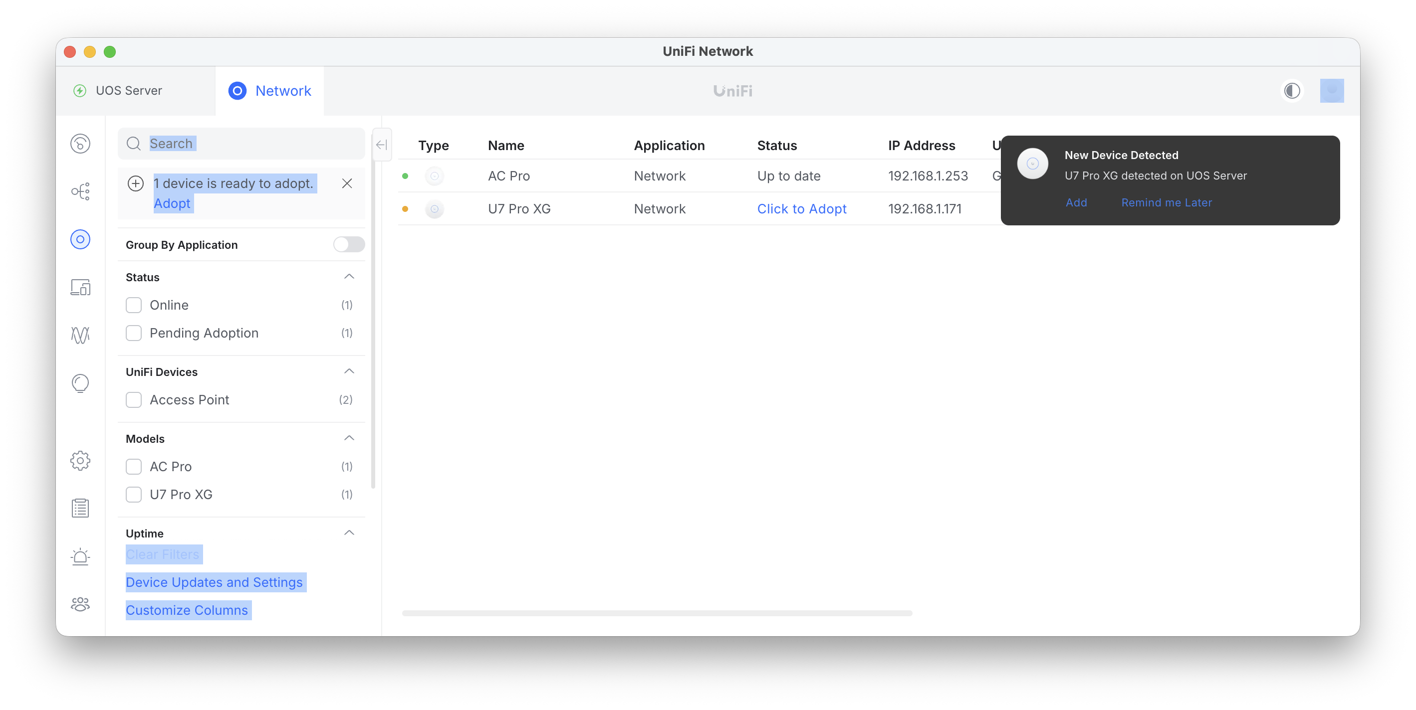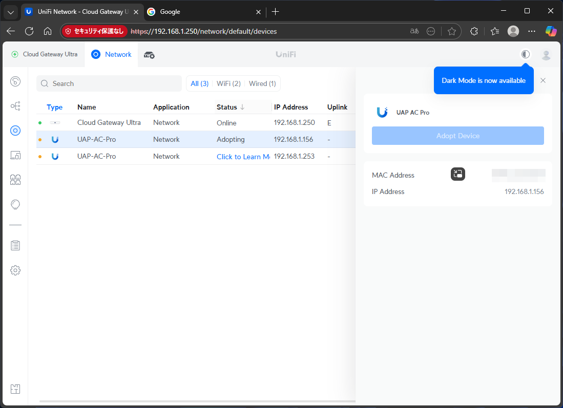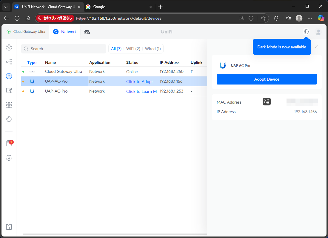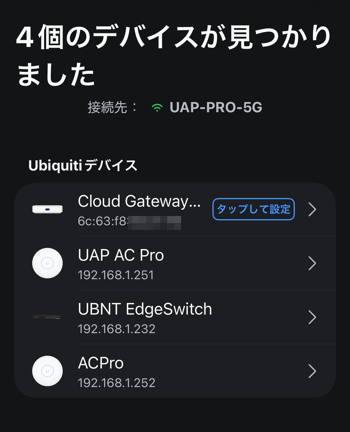 暫くすると、Mac用コントローラに新しいUniFiデバイスが表示される。