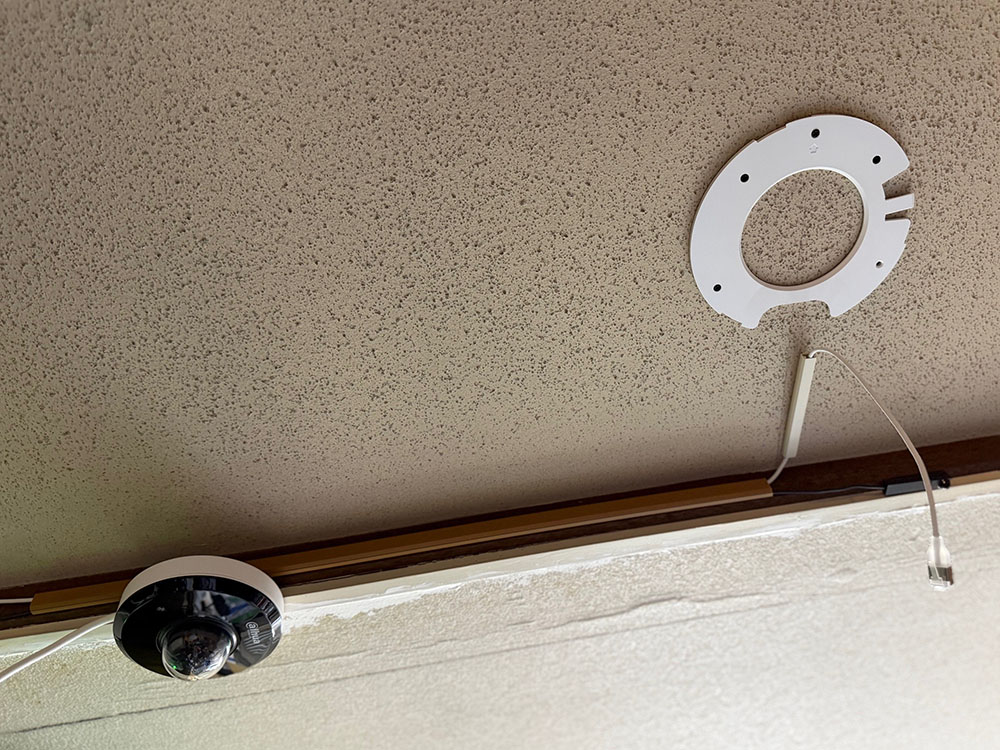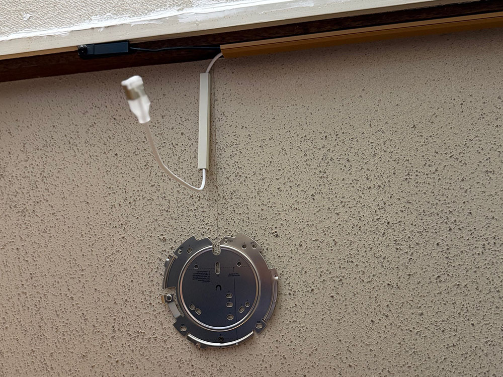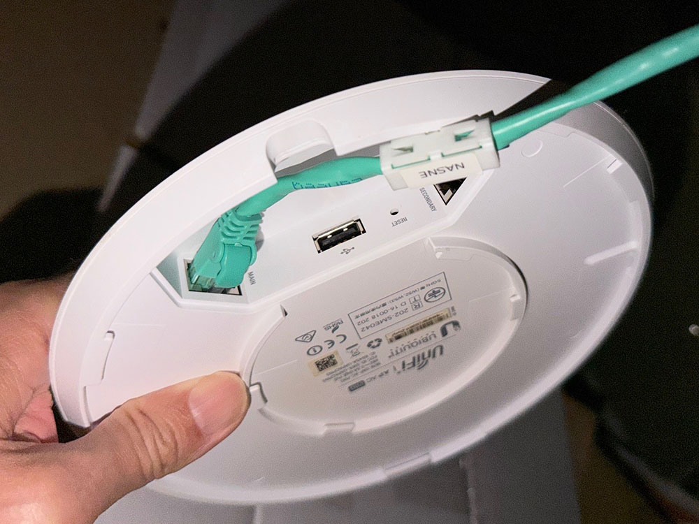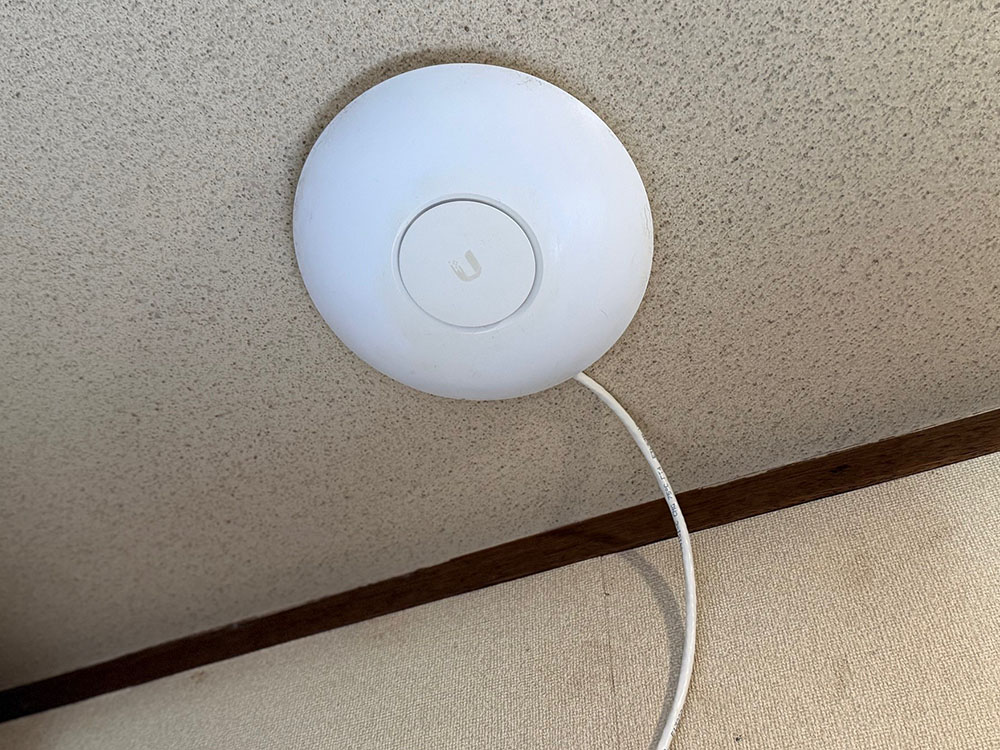 ベースプレートを木ねじで天井石膏ボードに固定して、LANケーブルを取り付けたAC Proを捻ってはめ込む。LANケーブルはPoEインジェクターに接続。給電だけを行う接続だ。