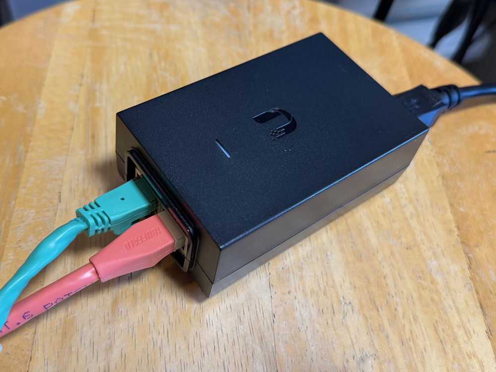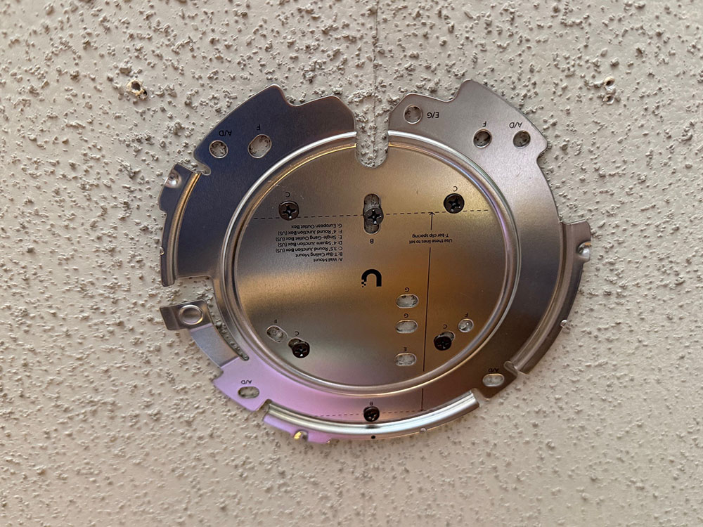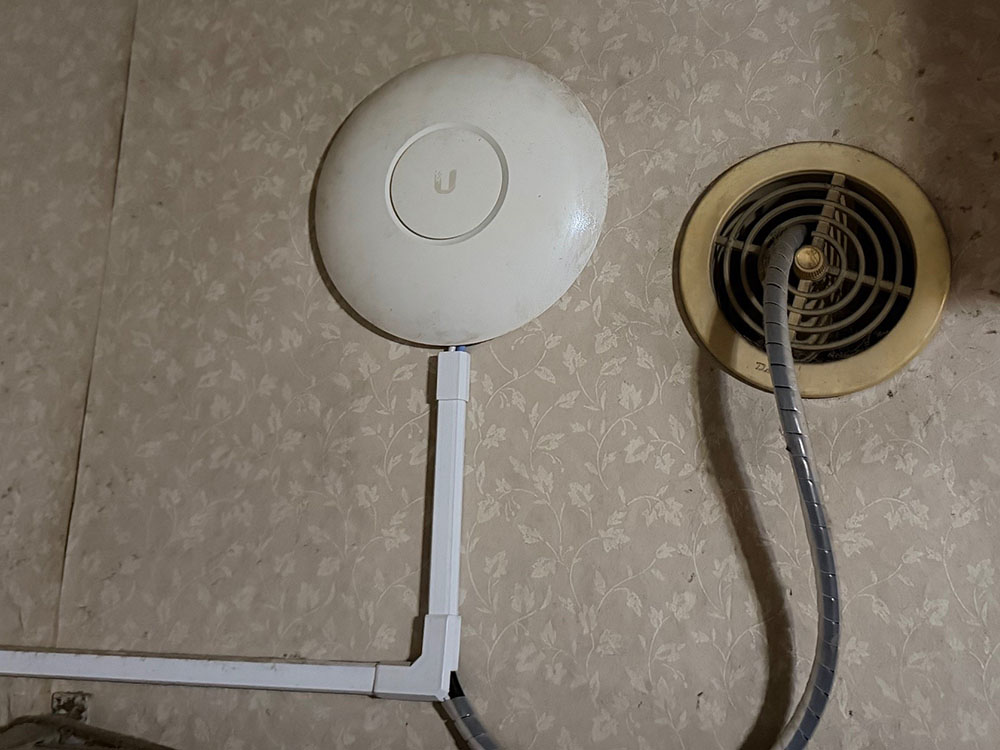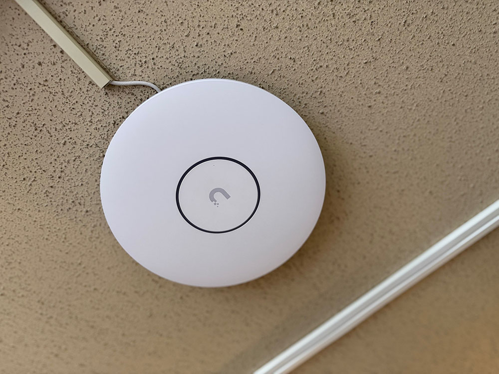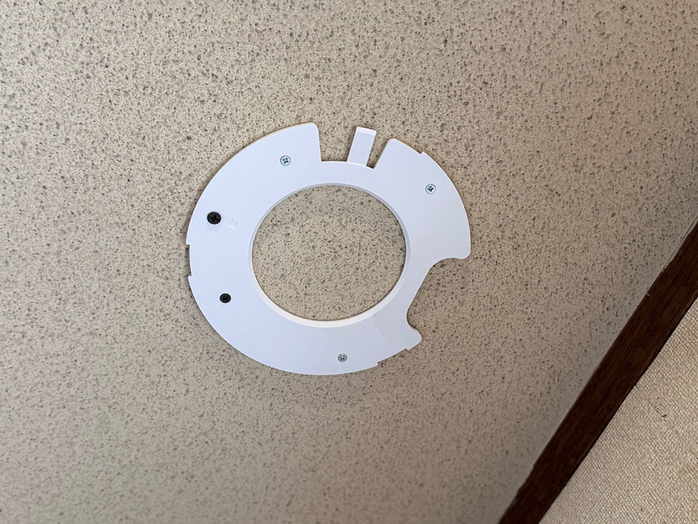 ベースプレートを木ねじで天井石膏ボードに固定して、LANケーブルを取り付けたAC Proを捻ってはめ込む。LANケーブルはPoEインジェクターに接続。給電だけを行う接続だ。