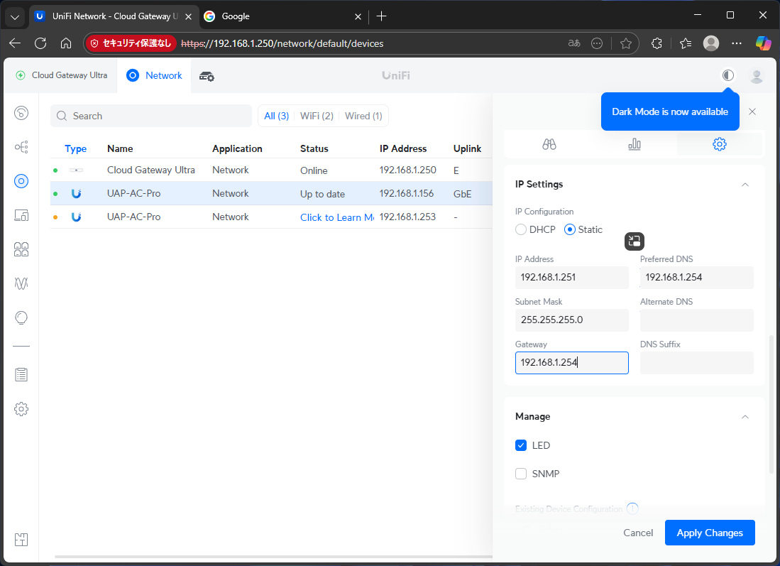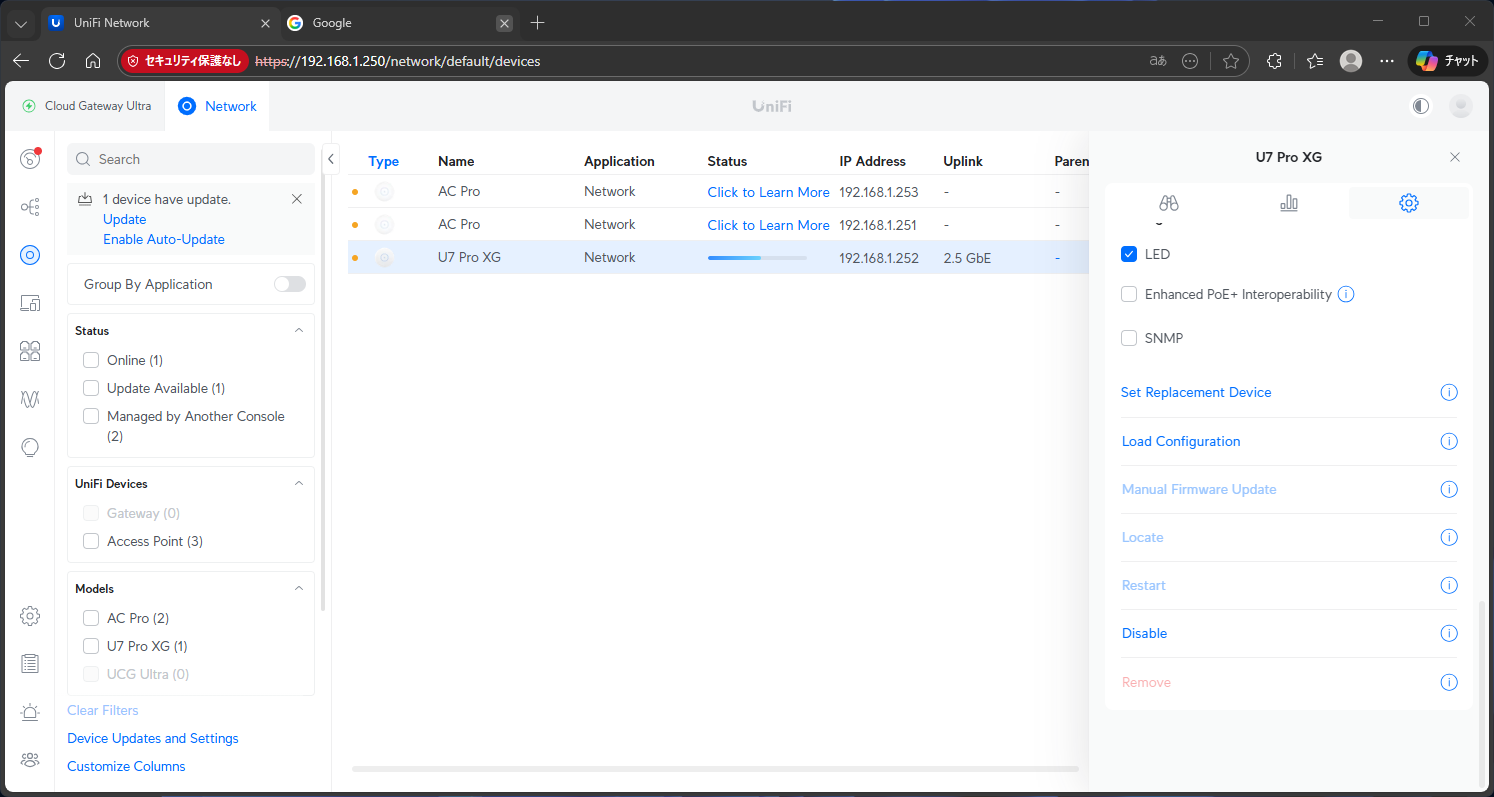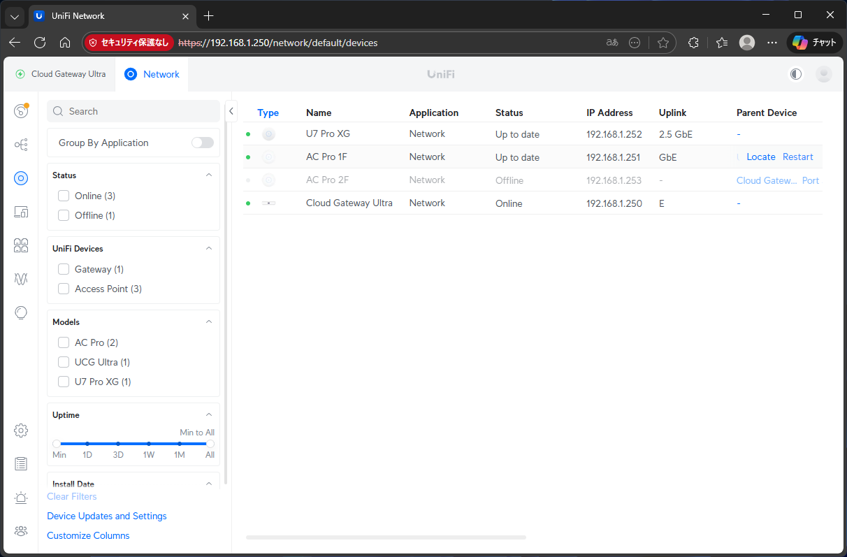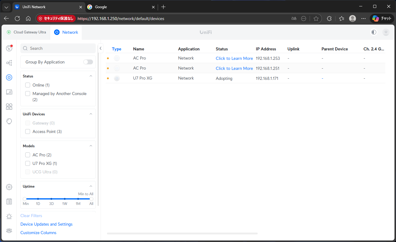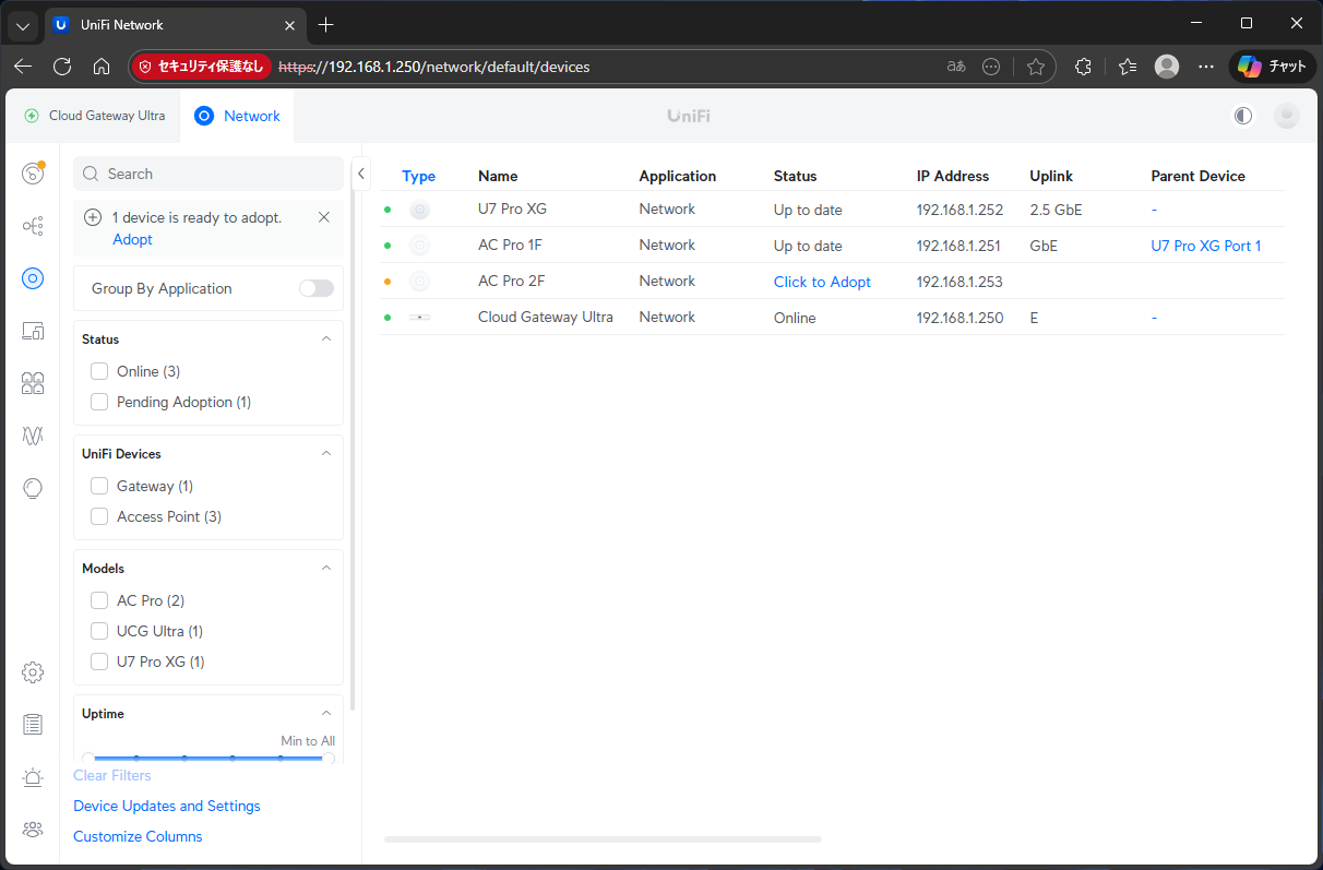 その後、東京に戻り、居間のAC Proと2Fの仮接続中のAC Proをリセットピンで初期化して、CGUからAdoptする。