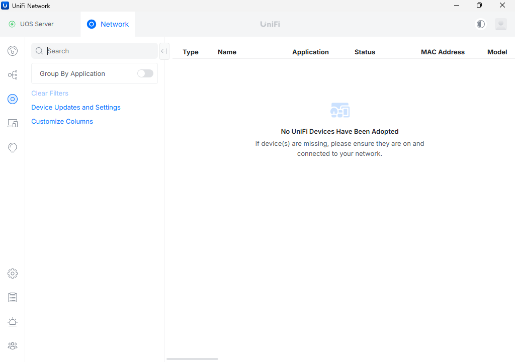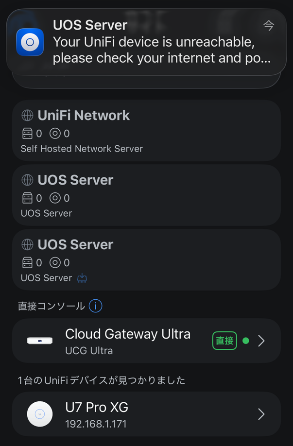 また、起動後にUniFiデバイスを検索するも、何も見つからない。