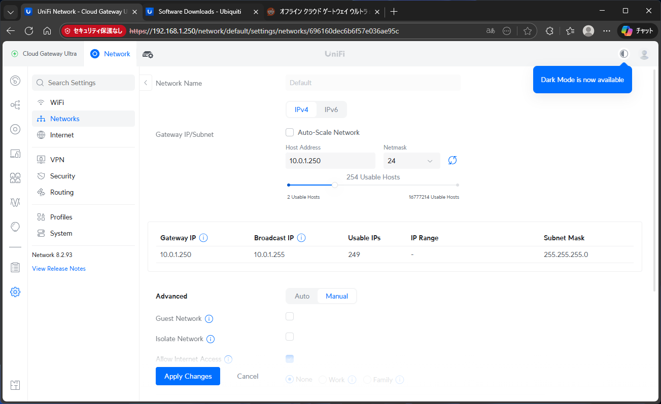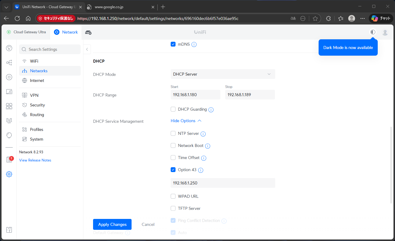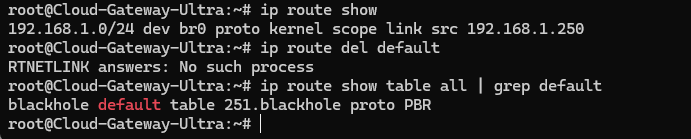 さらにGeminiに聞いて、WAN側接続がない状態でLAN側のデフォ結束を割り当てる方法を教えてもらう。