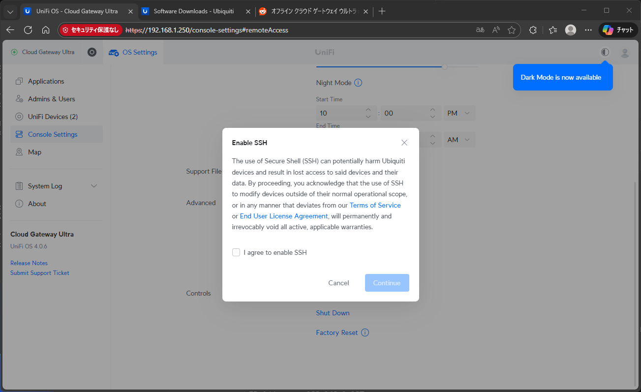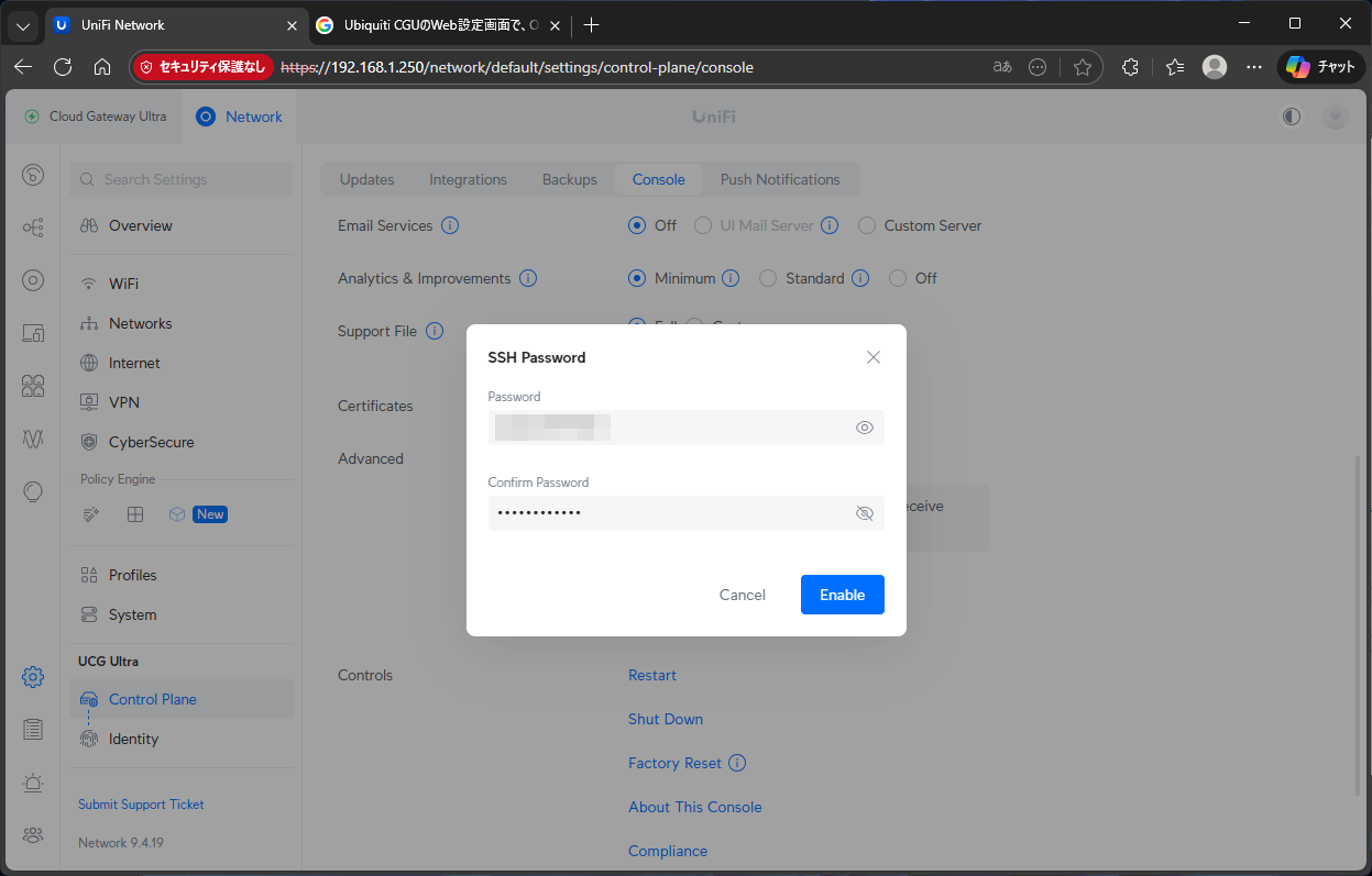 一度本体を初期化しているので、改めてCGUのSSHを有効にする。