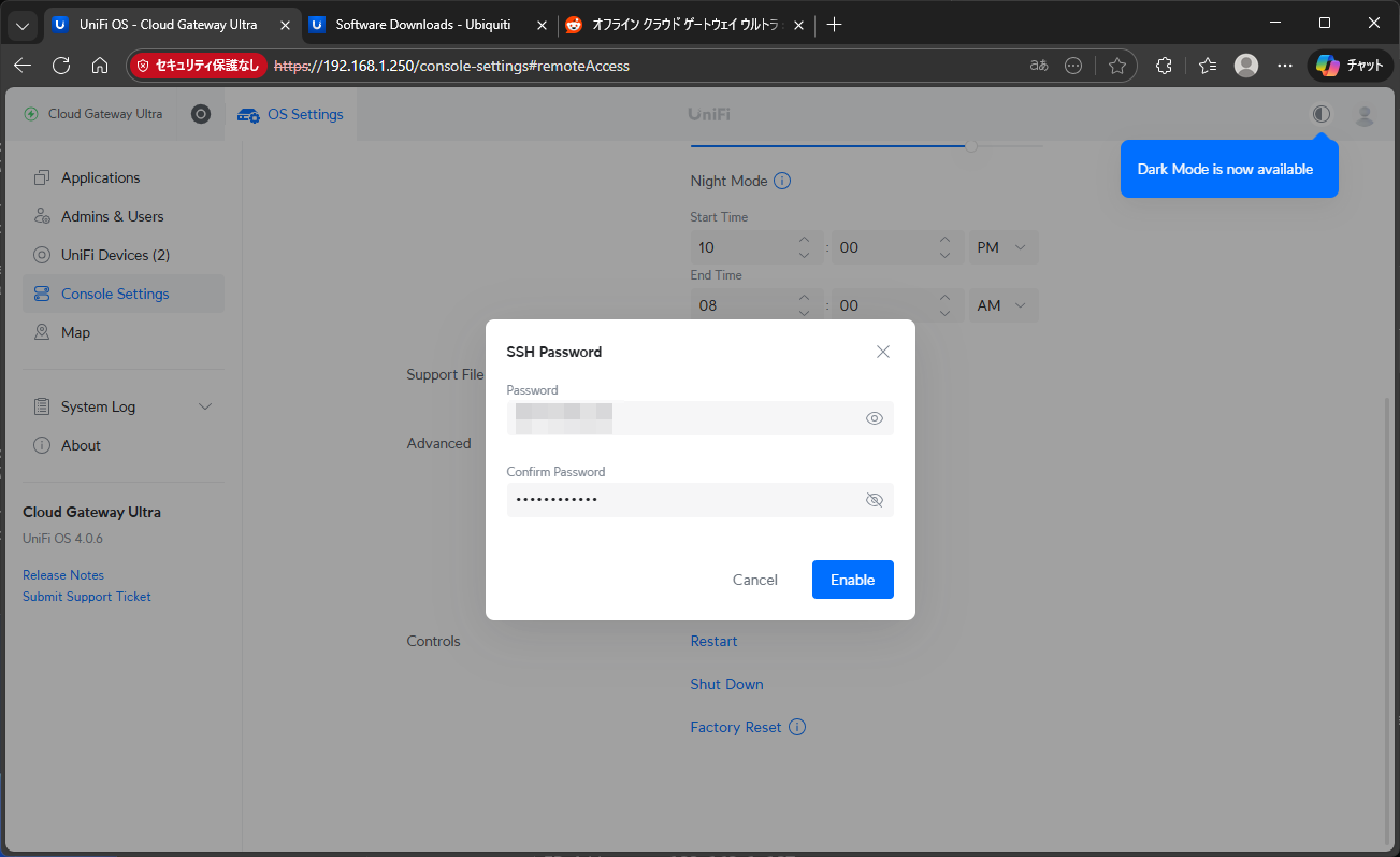 以下は Ubiquiti Cloud Gateway Ultra(CGU)を、インターネットに出さずに SSH 経由でローカル FW(UniFi OS)をアップデートする標準的な手順です。
