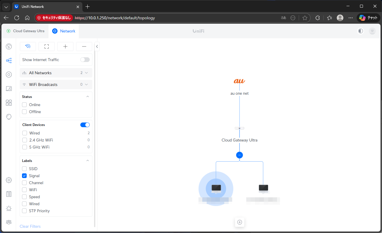 リセットして追加したAC Proの管理画面を見ると、接続しているクライアントが、家庭用のVLANに紐づけたSSIDにしかぶら下がっていない。