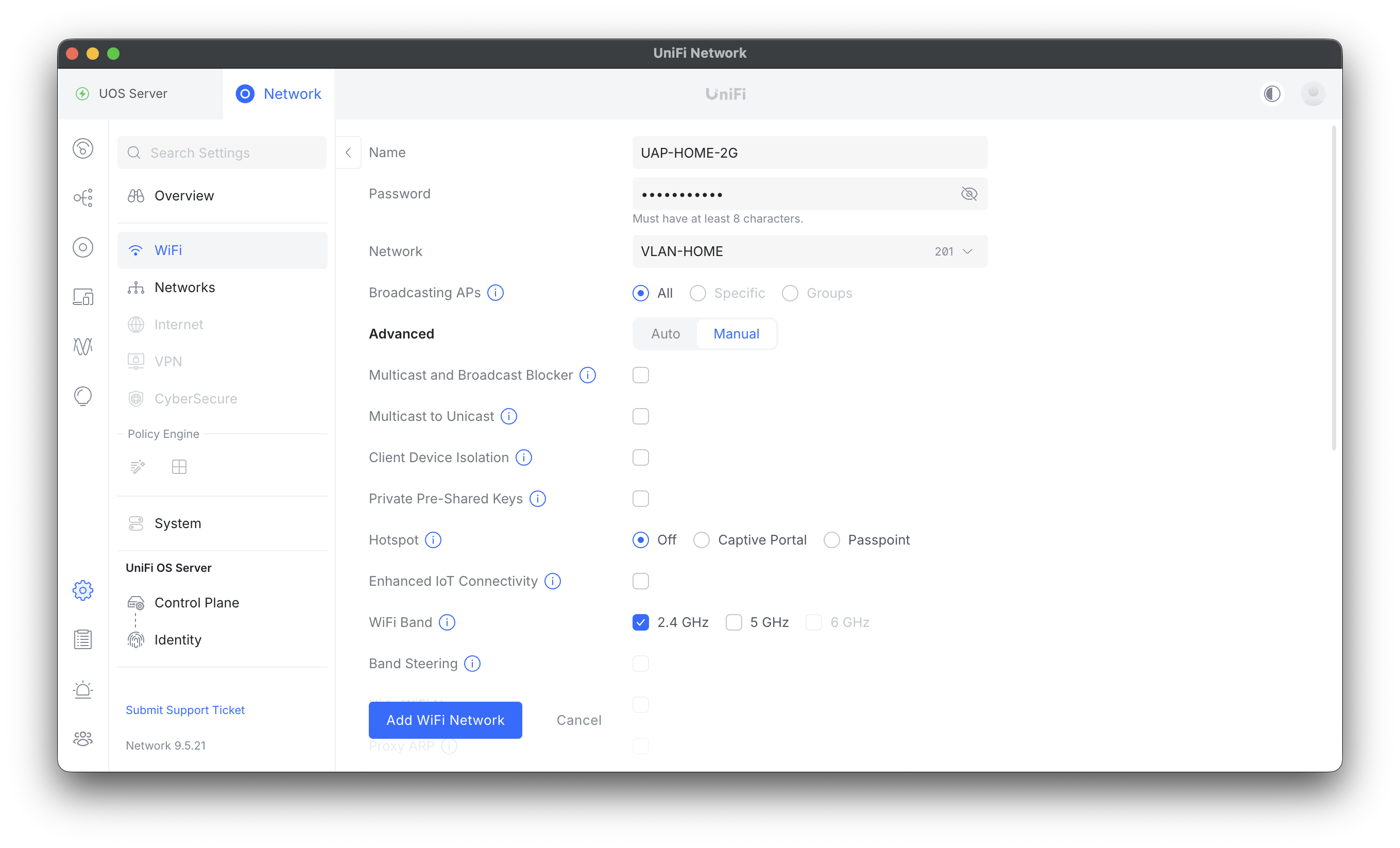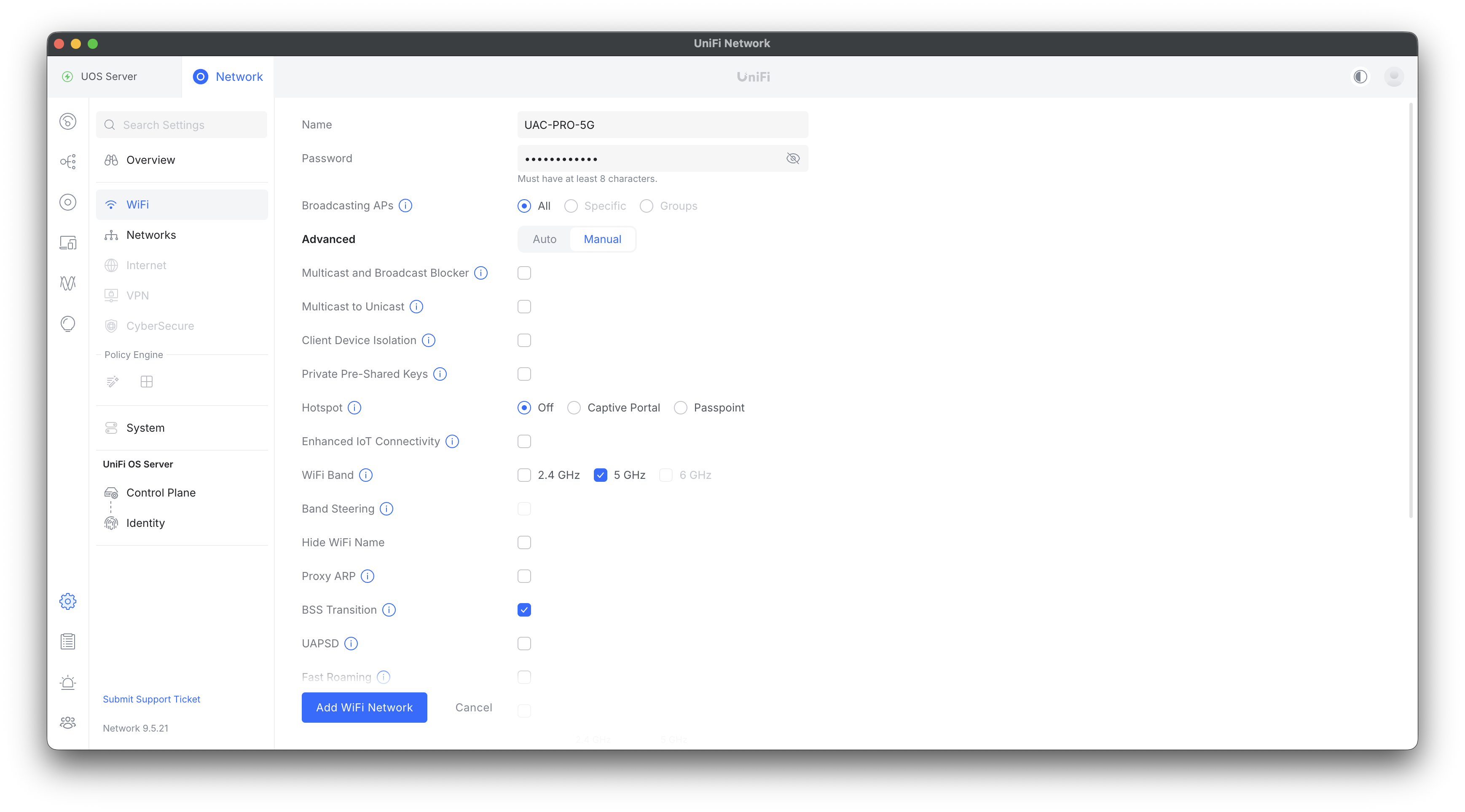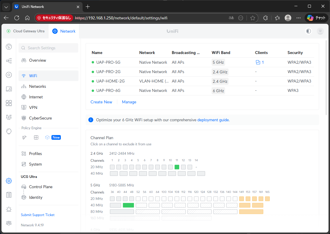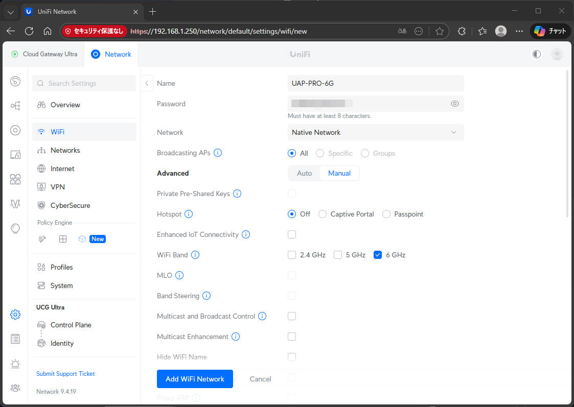 UAP-PRO-5G、UAP-PRO-2G、UAP-HOME-2Gの従来のSSIDに加えて、UAP-PRO-6Gを追加で設定する。