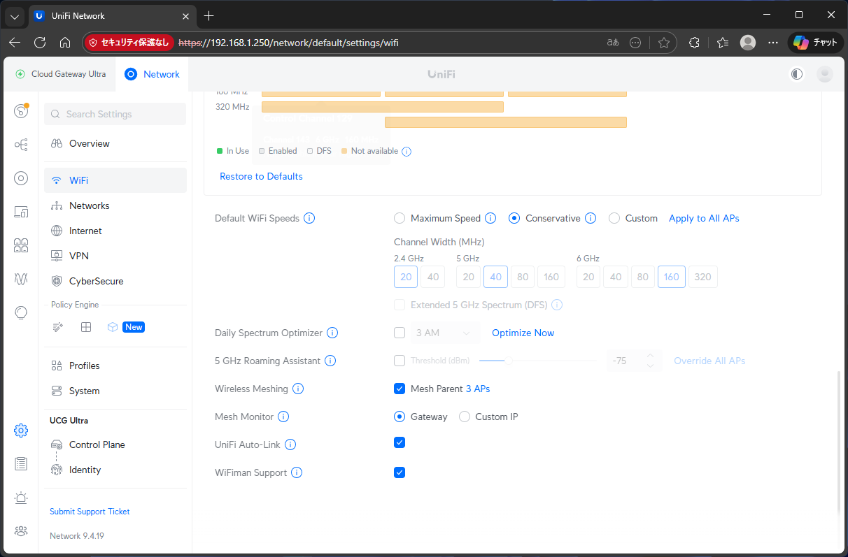 設定を確認すると、Wireless Uplinkという項目はないが、Meshは有効になっているので、恐らく問題ないだろう。