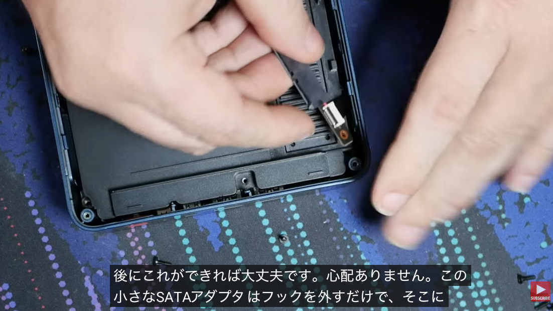 さらにYouTubeで開封動画などを確認すると、ハッキリしないのだが、SATAリボンケーブルを取り外す際は、コネクタのフックを外す・・と言ったコメントが記録されている。