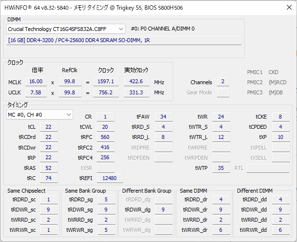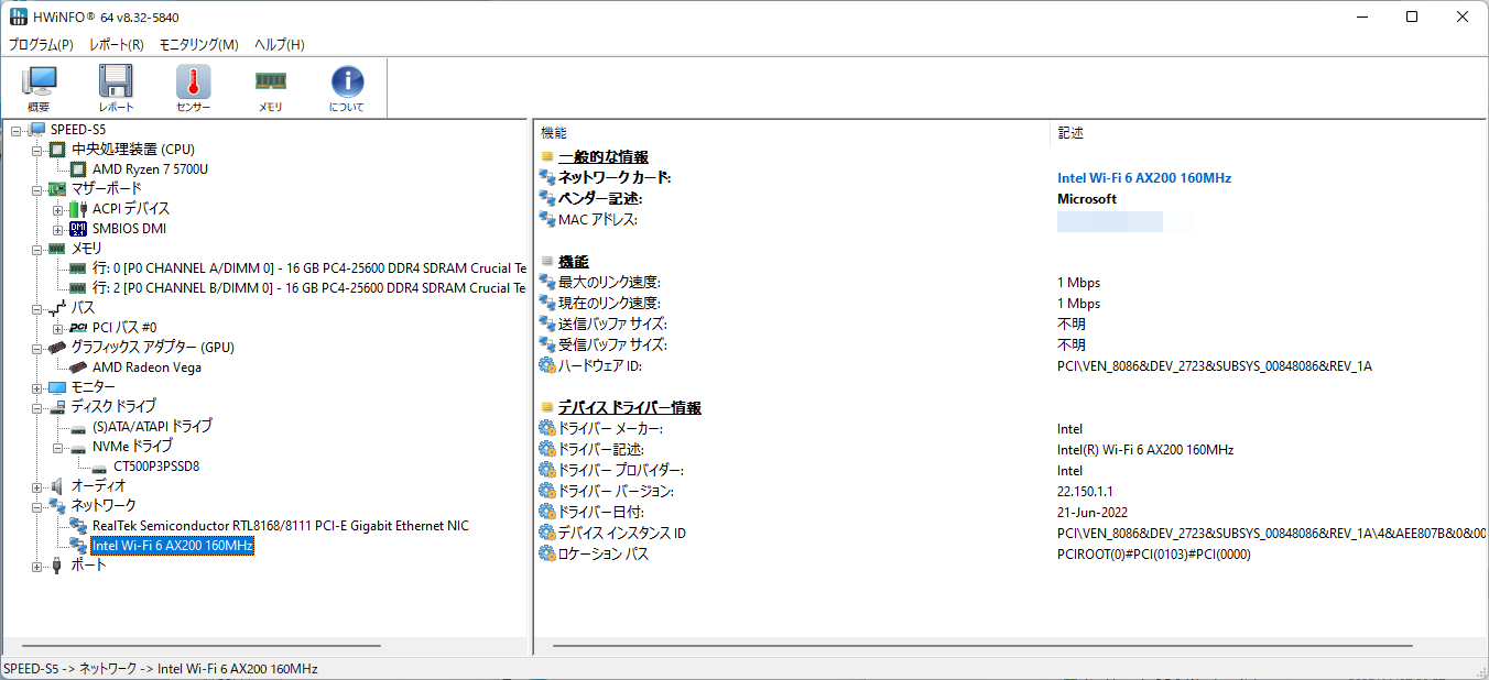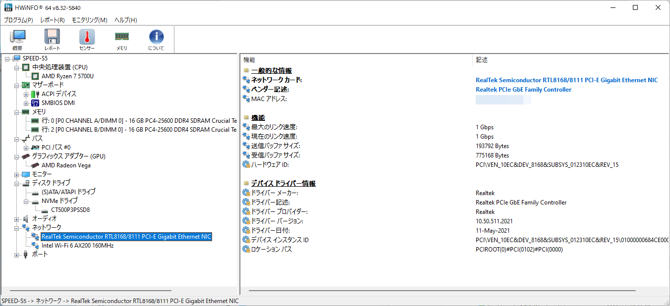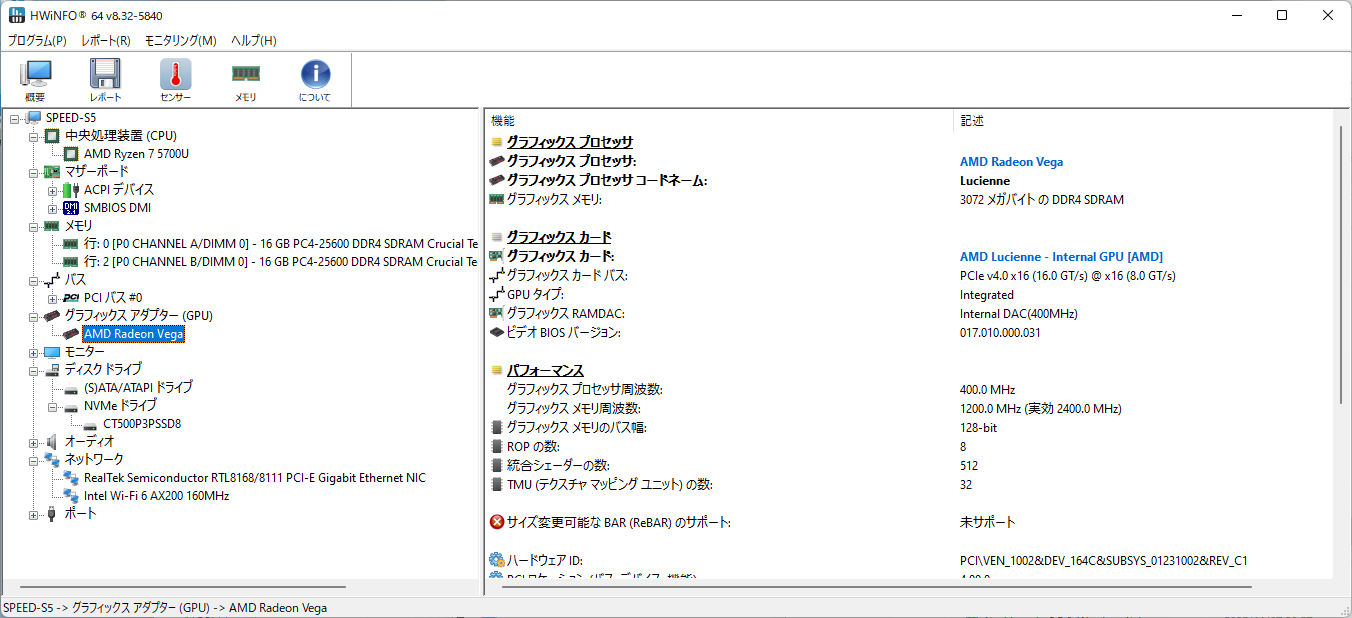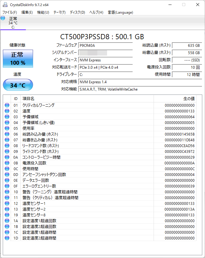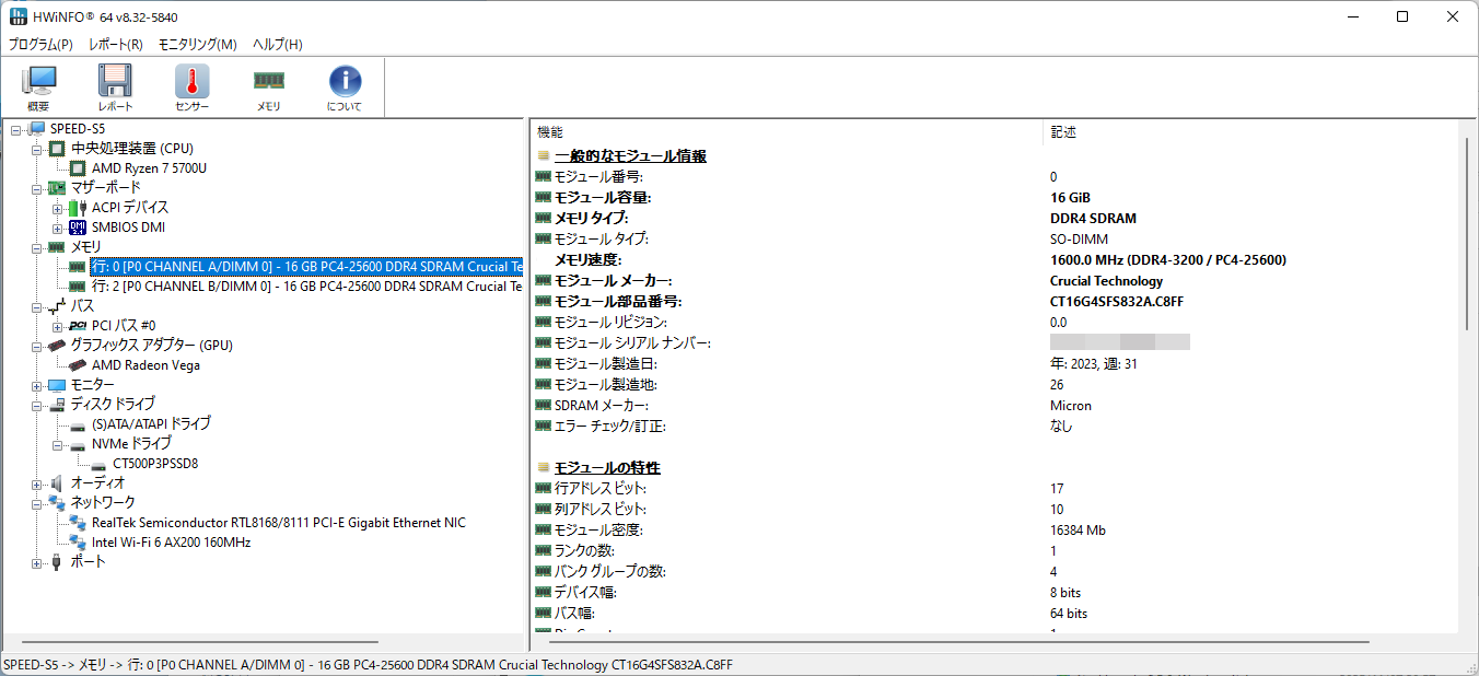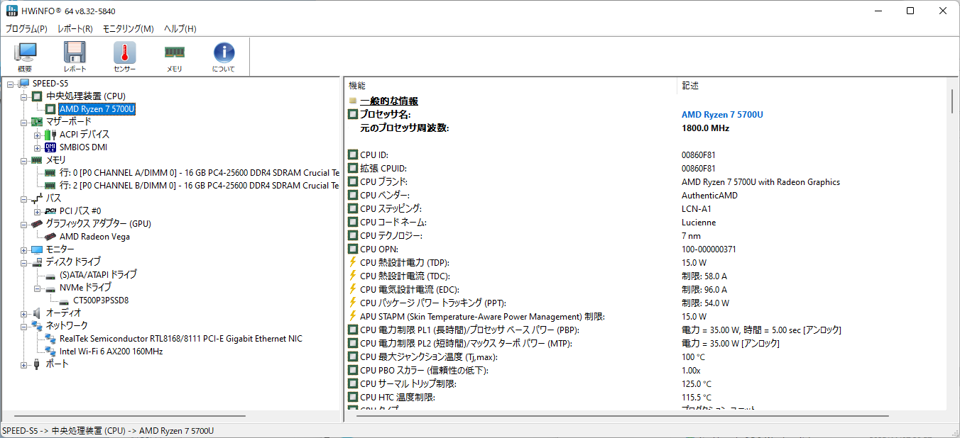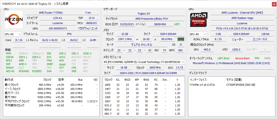 まず、SSD。デバイスマネージャーに記載されている型式、CT500P3PSSD8から調べると、CrucialのP3 PlusというPCIe 4.0対応NVMeのSSDだった。搭載チップは当初QLCで、その後TLCに変わったらしい。