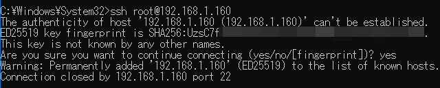 ただ、ホストリストに永久に追加しました・・とのメッセージも有り、二回目に接続したらパスワード認証画面に切り替わった。
