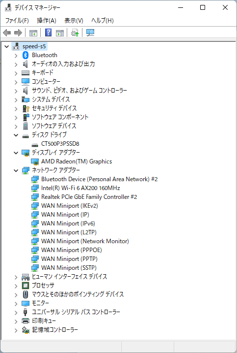 SATA SSDを装着して、Trigkey S5を起動。デバイスマネージャを確認したら、無事SSDが認識された!