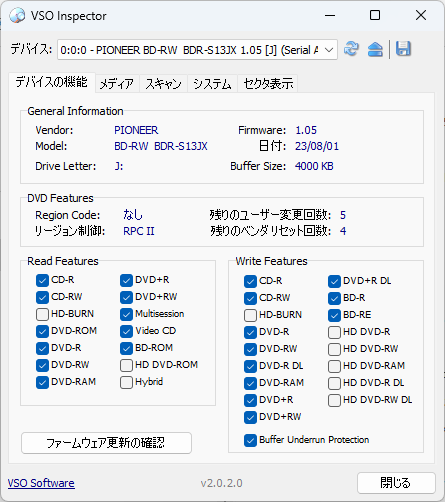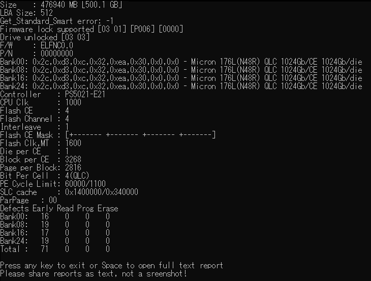 余談だが、基板の接写ではコントローラの型番が読み取れなかったが、ツールによるとPS5021-E21となっている。