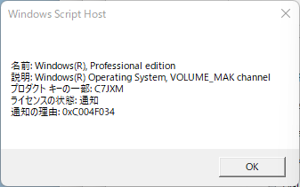 OSのシステム情報からライセンスを見ると、ライセンス数が上限に到達したと赤字で表示されている。これはボリュームライセンスである事は間違い無さそうだ。