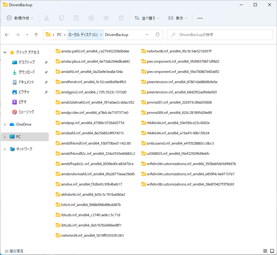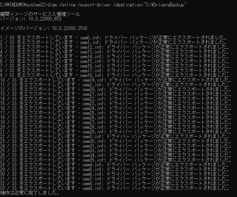 さらにdismコマンドで現在のOSに組み込まれているデバイスドライバ類をエクスポートする。