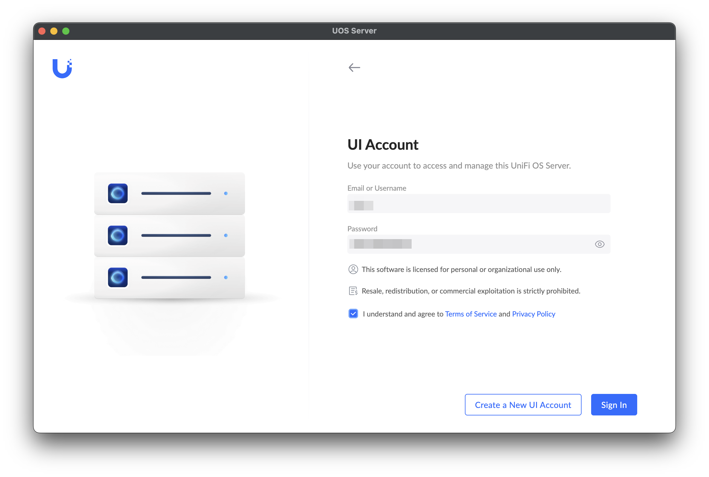 コントローラアプリのUniFi OS Serverを起動すると認証画面が。