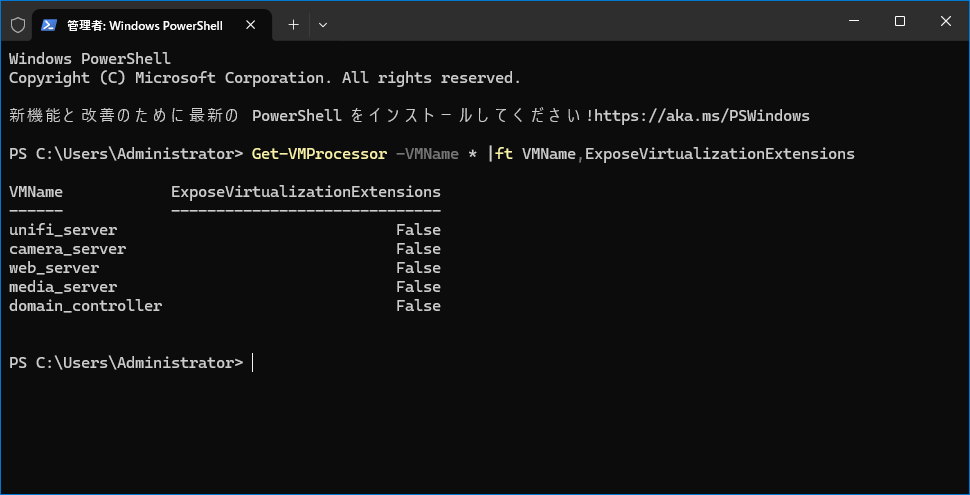 Webでも調べると、Windows環境での入れ子の仮想化設定方法が紹介されている。