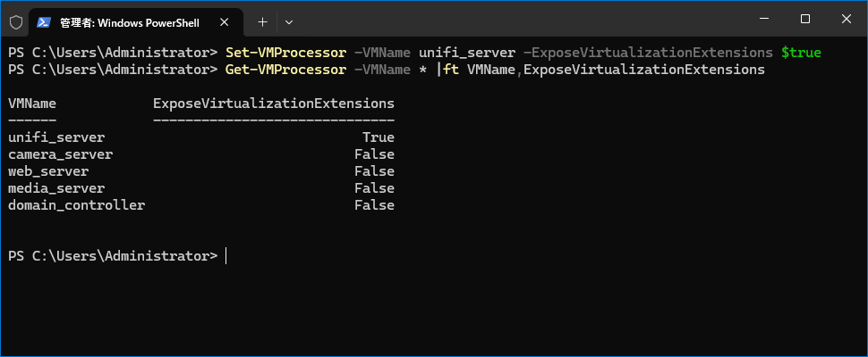 Set-VMProcessor -VMName unifi_server -ExposeVirtualizationExtensions $true