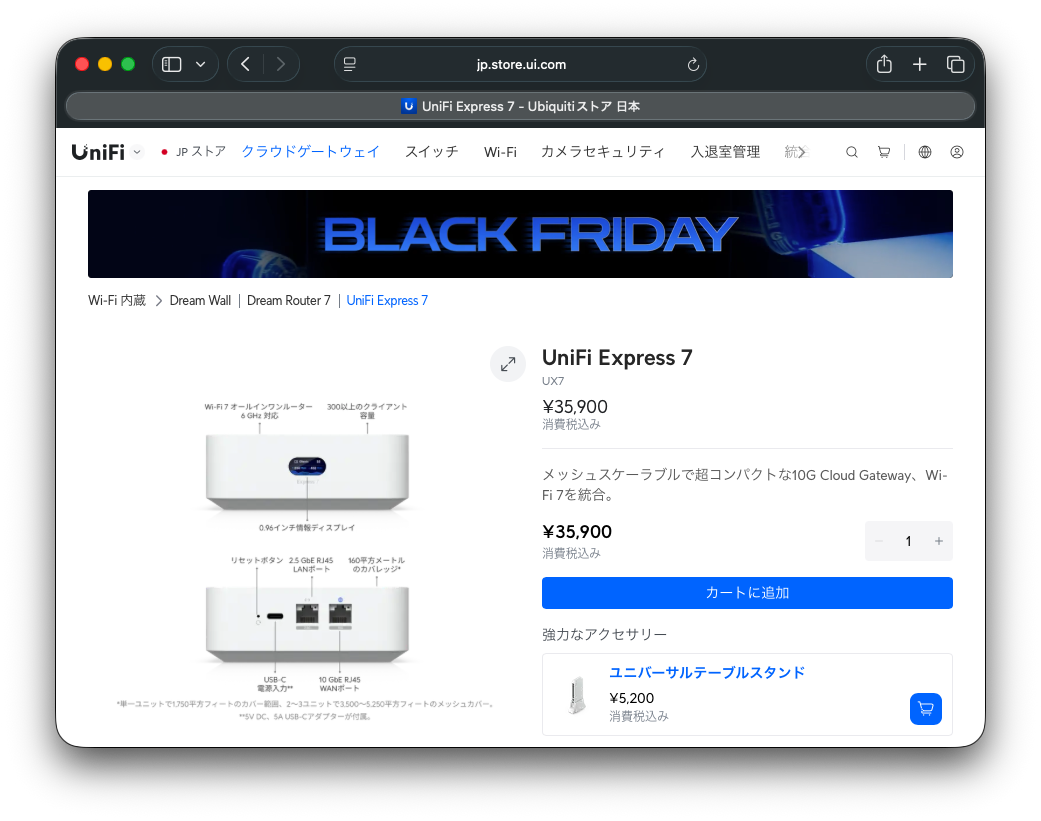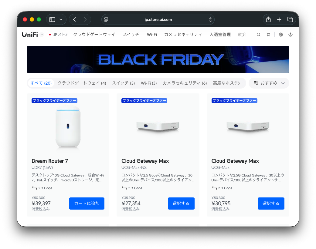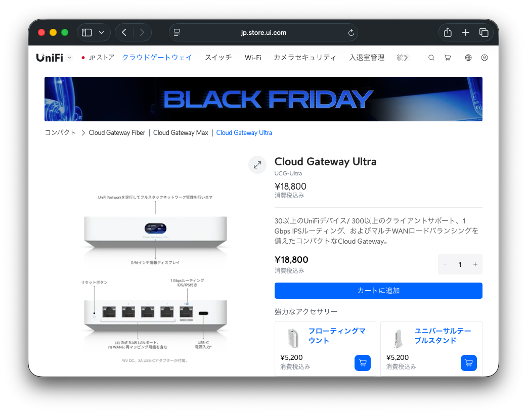 この日、洋食屋マックの開店を待ちながらスマホを眺めていると、Ubiquitiストアでブラックフライデーセールが開催されていることを知る。