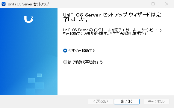 インストール後、UniFi OS Serverを起動すると、コマンドプロンプトで、