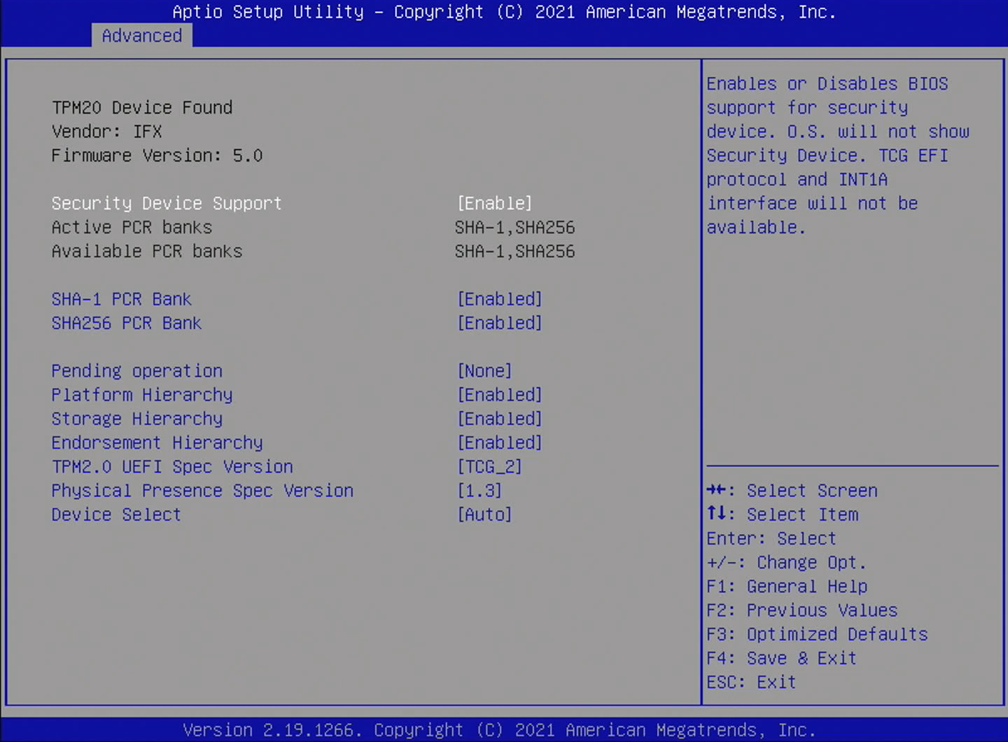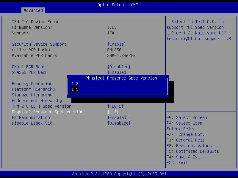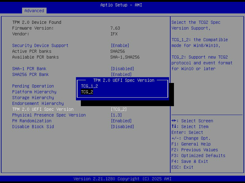 実装後起動して、UEFI設定でTPM2.0モジュールが認識されていることを確認。