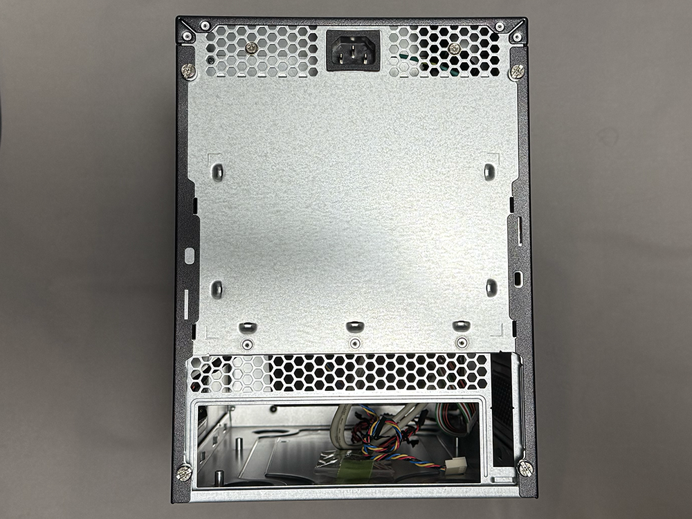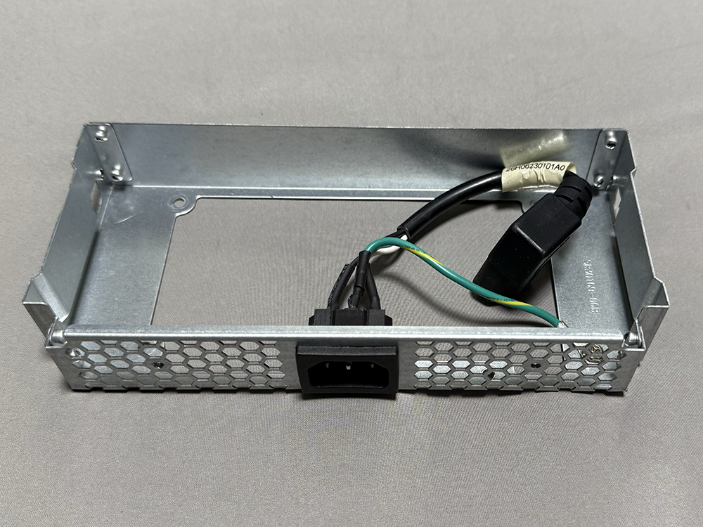 このPCケースは少し変わっていて、電源をケース内部に隠蔽して、背面のACソケットから伸びる短いAC延長ケーブルを接続する。