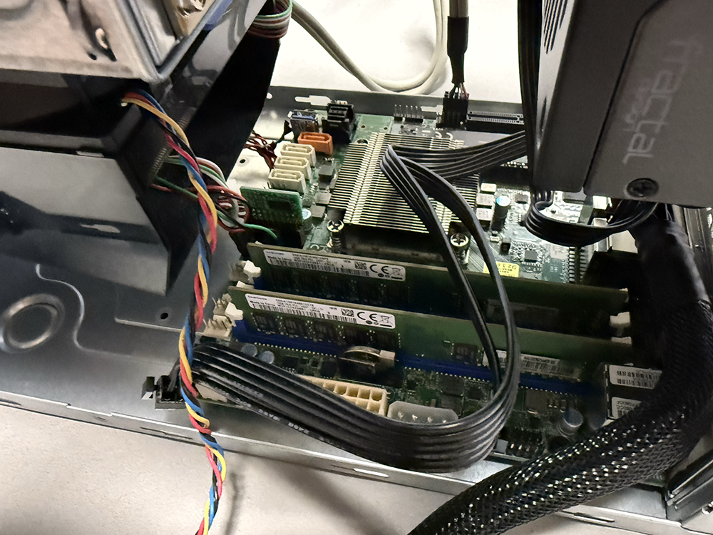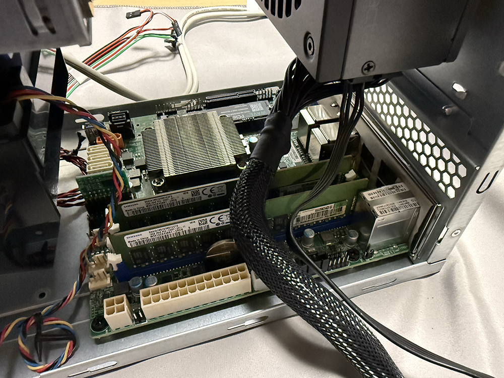 電源ユニットからATXとCPU電源をマザーに接続。12Vペリフェラル4Pはケース内のバックプレーンに接続。DCケーブルは3本のみで、柔らかいフレキシブル仕様のため、取り回しはし易い。