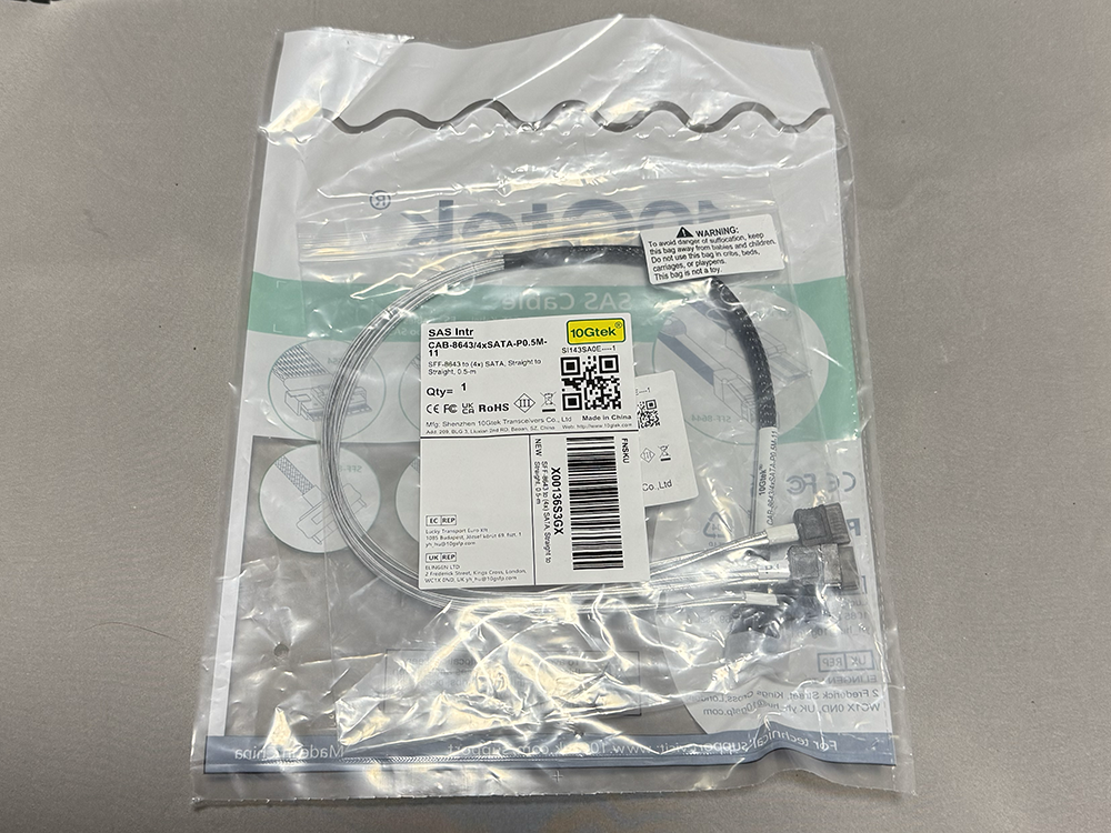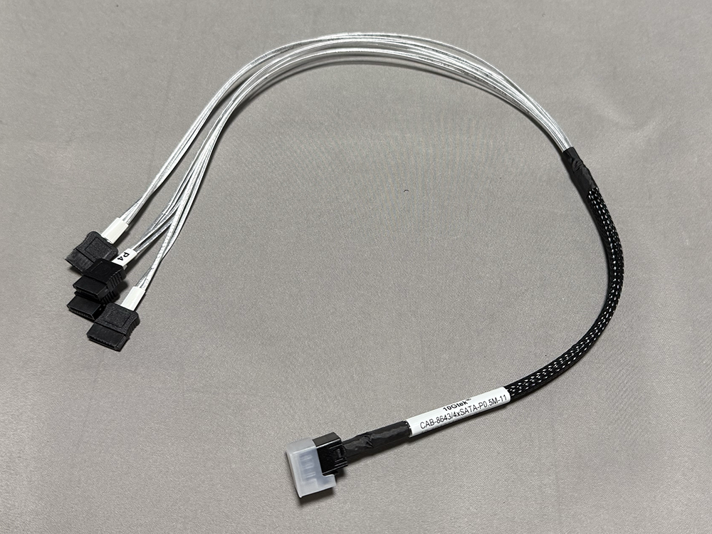 Mini SAS HD(SFF-8643)から4xSATAへのファンアウトケーブルも新規に購入したので、開封して結線する。
