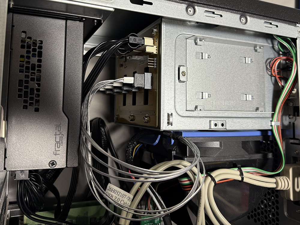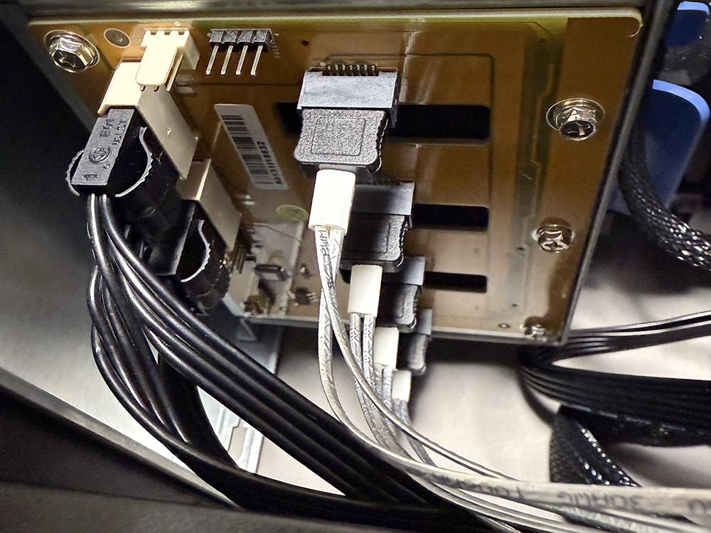 HDDベイ背面にバックプレーンがあり、ここに4xSATAとペリフェラルDCケーブルを接続する。