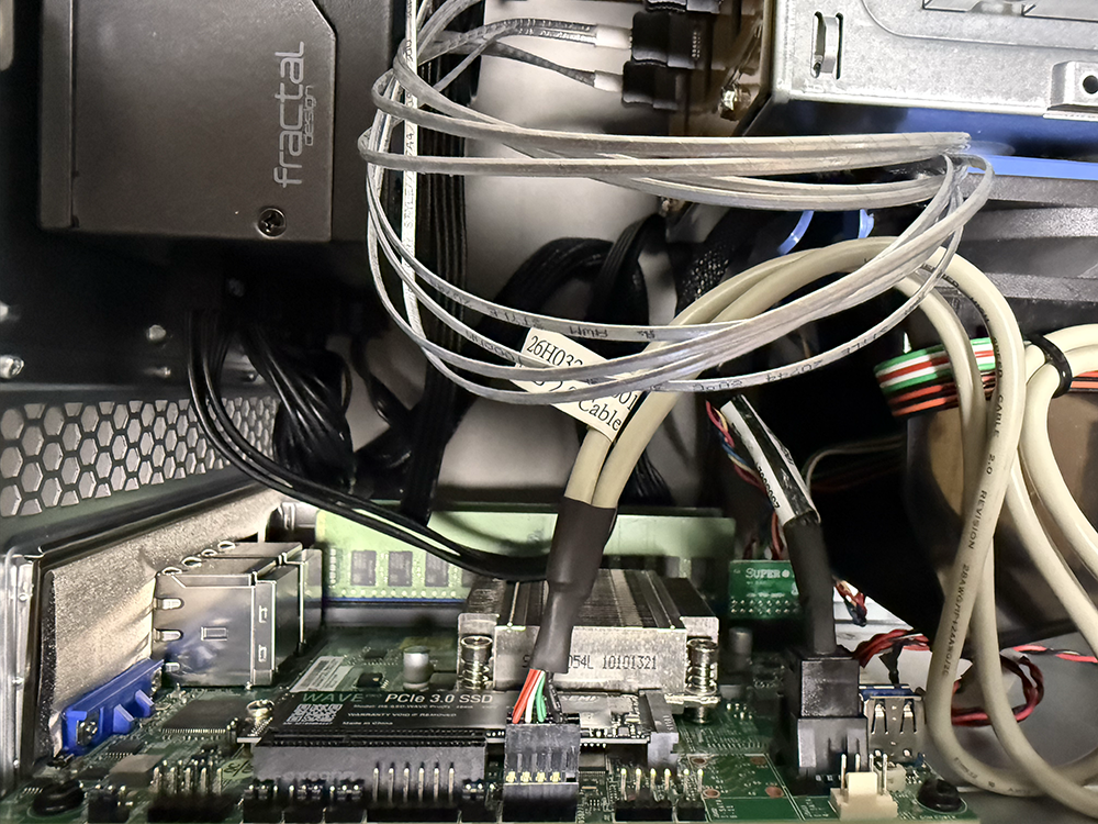 ケース-マザーボード間のケーブルは、フロントIO、ファン、フロントUSBで、マニュアルを見ながら接続する。