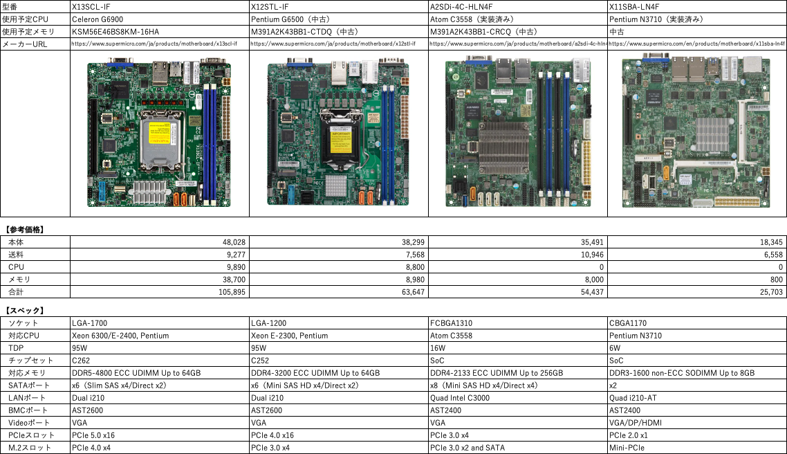 Supermicroの12th Core、10th Core、Denverton SoCの3つに、さらにもう一つ、Braswell世代の古いAtomも加わり悩んで、考えがグルグル2点3点した。