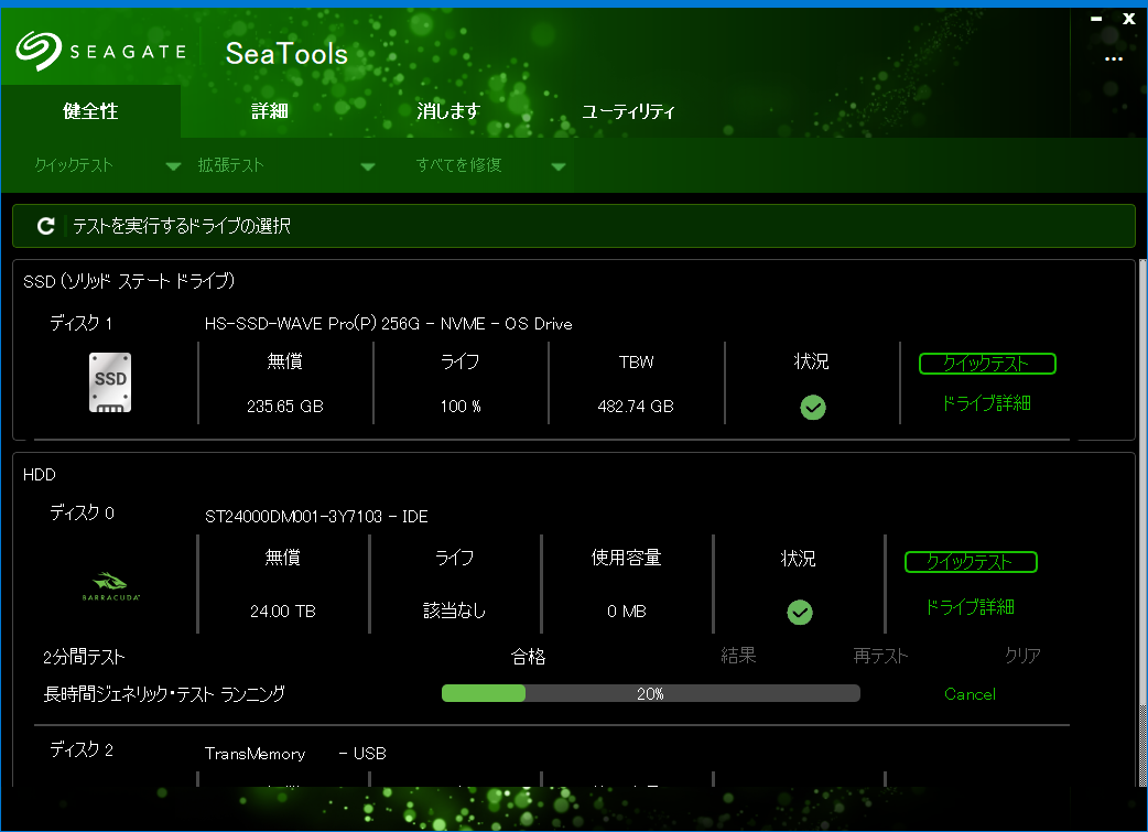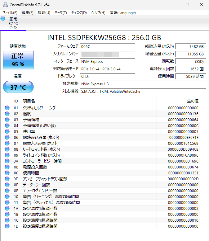 Intelのお下がりのSSDのパフォーマンスも悪くない。SMARTの健康状態が95%だが、まあ、普通に使う分には全く問題ないだろう。