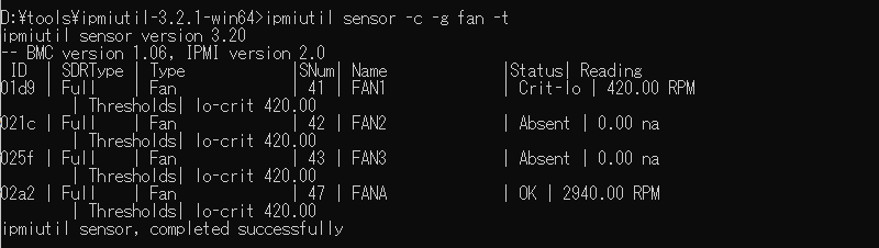 前回の記録を元に、まずは以下のコマンドでファンのステータスを確認する。