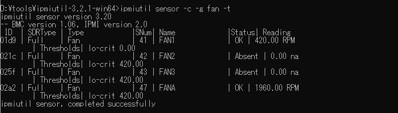 設定後のファンの閾値を確認すると、lo-critは0.00になっている。