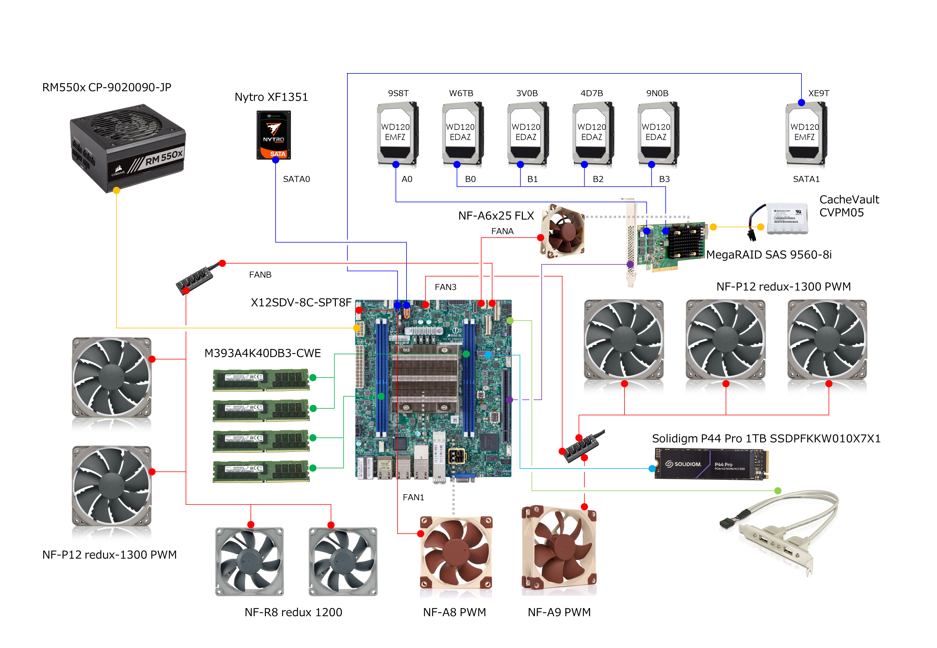 今回発注したSupermicroのマザーボード、X12SDV-8C-SPT8Fには、コンスーマ向けのマザーボードでは見慣れない、自分的には未知のインターフェースが実装されている。 まずは、OCuLink。X12SDV-8C-SPT8Fにはこのコネクタが1つ実装されていて、 1 OCuLink Connector (4 SATA/PCI-E 3.0 x4) とスペックシートには記載されている。また、オンボードデバイスの項には、6 SATAポートとも記載されているが、I/OとしてのSATAポートは2つしかないことから、残りの4つはOcuLink経由で接続すると考えられる。 調べると、OLIOSPECなどでは、OCuLinkからSATAx4に分岐するファンアウトケーブルが販売されている。 ![]() また、OCuLink to U.2ケーブルも販売されており、こういったケーブルを使用すれば、U.2のストレージに、PCI-E 3.0 x4(NVMe)で接続することも可能なようだ。 ![]() OCuLinkは2015年頃から市場に出始めたようだが、PCIeを直接出すことができ、ディスプレイや外部ストレージも接続可能なThunderbolt的なマルチなインターフェースを目指していたようだ。今回初めて名前を知ったくらいで、少なくともコンスーマ市場では全く利用されていないインターフェースだと言える。 そして、Slim SAS。こちらの方が名前は聞いたことがある。平べったい内部結線用のコネクタで、漠然とSASの新しいインターフェースなのかな・・くらいにしか捉えていなかった。 こちらは、スペックシートの、PCI-Eの項に記載があり、 2 PCI-E 4.0 x8, via SlimSAS と書かれている。 確かに、基板写真上には、細長いコネクタが二つ実装されているのが分かる。 こちらも、OLIOSPECで関連ケーブルを調べると、正式名称はSFF-8654と言うそうで、SATAx8のファンアウトケーブルや、SFF-8654 to U.2のケーブルなどが販売されている。 ![]() ![]() Broadcom MegaRAIDの最新版、9500シリーズでは、内部用miniSAS HD(SFF-8643)に変わって、このSlim SASアダプタが実装されている。 X12SDV-8C-SPT8Fでは、PCI-E 4.0 x8対応で、OCuLinkよりも高速なインターフェースとして実装されている。SFF-8654から、2つのOCuLinkに変換するケーブルもあり、その性能を端的に表している。 M.2と対比されてたまに聞くことがあるU.2は、NVMeの外付け(外付けと言っても筐体内での外付け)版とも言える規格で、所謂SASのコネクタと似たような形状をしている。所謂SASのコネクタはSFF-8482と言い、U.2はSFF-8639と言うそうだ。 話は脱線したが、この2つのSlimSASを使えば、U.2のNVMe接続の高速ストレージを2台増設することができるようだ。 ということで、高性能な最新のストレージ系インターフェースを2種類、3ポート実装しているX12SDV-8C-SPT8F。一瞬、MegaRAIDを使わなくても、これら(特にOCuLink経由のSATA)インターフェースを使って、オンボードRAIDコントローラのVROCでRAID5+スペアを組んでもいいかな・・とか思ったりした。 しかしまあ、MegaRAID周りのパーツを既に買い揃えてあるし、VROCとMegaRAIDでは性能がかなり違いそうなので、これら折角最新のインターフェース類は、未使用のまま終わりそうだ・・。 1年から1年半も寝かせることになってしまった、仮想基盤用のハードディスク群。WD Elements 12TBが6台ある。マザーボードも発注できたので、そろそろ準備として、HDDの事前検査を実施することにした。 ![]() まず、Elementsを分解。何度やっても面倒だ。いい加減、ケースを綺麗な状態に保とう・・とかという気持ちも失せてしまい、大胆にマイナスドライバをケースの隙間に差し込み、ギシギシと爪を破壊しながらこじ開ける。 取り出したHDDでは、WD Lifeguard Diagnosticを走らせる。12TBということで、Extended Testに18時間くらいを要する。これを6台分なので、一週間ほど時間がかかりそうだ。 LC-LC デュプレックス マルチモード 光パッチケーブル(2.0mm LSZH OM3) 1m 380円x2@FiberJP.com LC-LC デュプレックス マルチモード 光パッチケーブル(2.0mm LSZH OM3) 3m 490円x2@FiberJP.com Ubiquiti UF-MM-10G対応互換 10GBASE-SR SFP+モジュール(850nm 300m DOM) 1,950円x2@FiberJP.com ![]() ![]() 10G用の光パッチケーブルとSFP+モジュール、FC.comで購入するつもりだったが、調べると、FiberJP.comというFC.comそっくりのサイトがあり、3割くらい安いことを知る。 悪い評判も無さそうなので、ほぼ同じ構成を同サイトで発注。 らだ、0.5mの短いパッチケーブルはなかったため、1mのケーブルになってしまった。また、光ケーブルの外皮だが、FS.comだがOFNRのみだが、FiberJPだと、OFNRに加えて、OFNPちLSZHが選択できる。 LSZHは、OFNRとOFNPに比べて、難燃性で有害部室を含まないとのこと。ただ、ケーブルの剛性が高く、柔軟性に欠けるらしい。一般的にはLSZHの方が上位グレードのようなのだが、FiberJPでは、LSZHが最安となっている。柔軟性に欠ける点が少し気になるが、今回試しで買ってみることにした。 SFP+モジュールはUbiquiti互換品を選定した。 5000円以上は送料無料で、佐川急便で送付されるとのことだ。 ようやく、Ice Lake-Dマザーを注文できたので、最後の、細かい必要物品を手配することにする。SFP+モジュールと、OM3の光ケーブルだ。 今回のマザー、X12SDV-8C-SPT8Fには、
