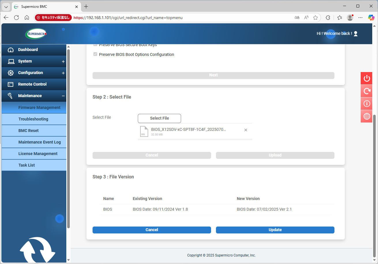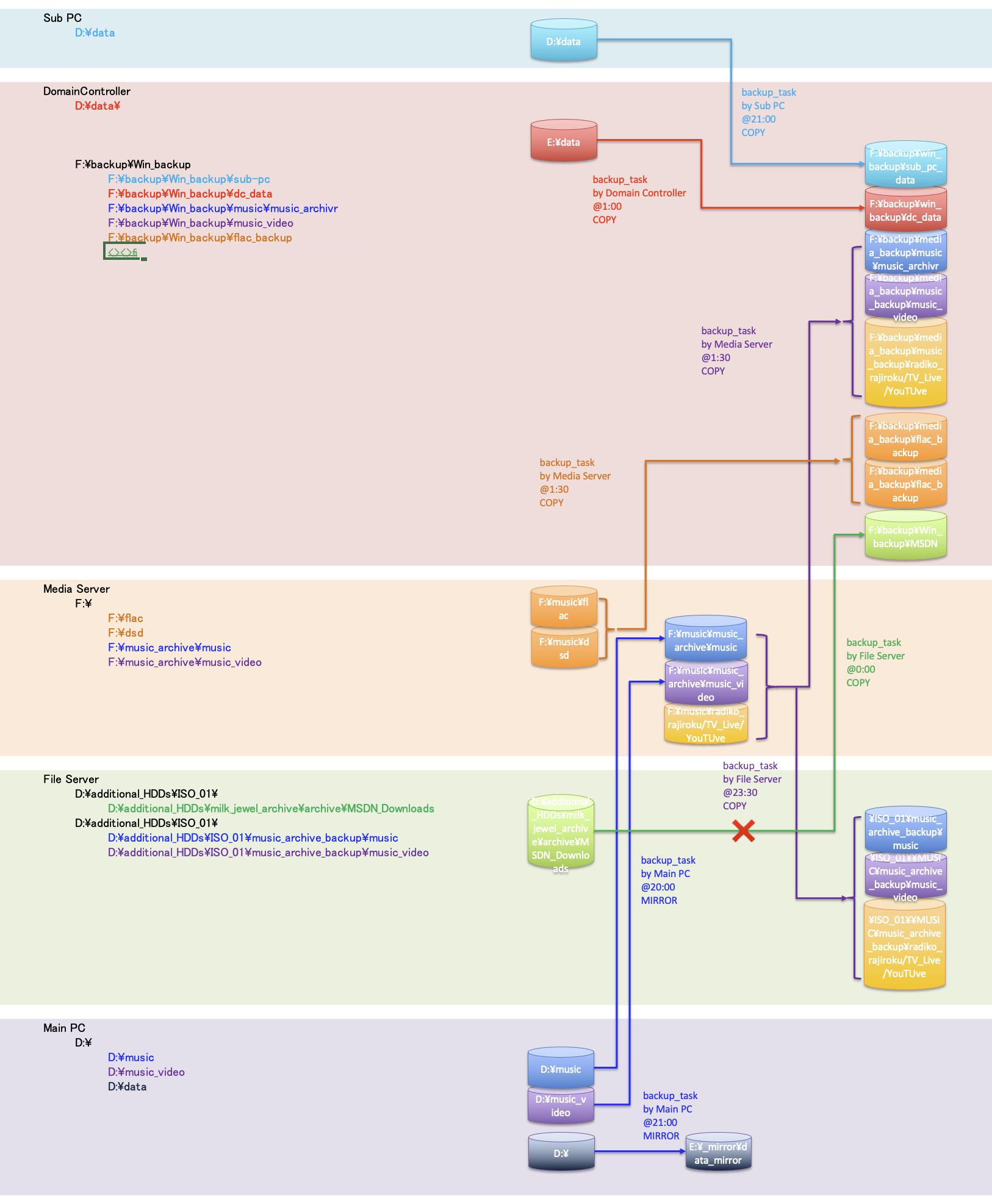 2016年に稼働開始した仮想基盤もそろそろ5年。システムの更新時期が近づいてきた。 2016年サーバは幾度かの微小な構成変更が加えられたものの、業務用マザーボードを中心にした初期構成の完成度が高く、ガラッと変更を変える必要はなさそうだ。基本構成は尊重し、各パーツをアップグレードしていく方向で、少しずつ準備を進めていくこととなった。 ![]() ・・クリックで詳細が見れます・・ サーバ内蔵パーツの接続構成図 Updateしていなかった、マザーボードのBIOSやBMCファームウェア、さらにはドライバも気が付いたらWindows Server 2025対応のものがUpされていたので、一気に更新することにする。 まずはBMCファームウェア。以前の失敗の轍を踏まないように、今回はOSをシャットダウンしてから作業に取り掛かる。 BMCは1.4.05から1.05に更新された。 ![]() ![]() ![]() INF、Aspeed、LAN、VROCが全て2025年の日付のものに更新されている。 ![]() VROCは9.1.0.1449に更新された。(使ってないけど) ![]() Granite Rapid-DことXeon 6 SoCのSupermicroマザーがいつの間にか発売されていた。 現行のIce Lake-Dを使い始めてまだ3年なので買い換える気は毛頭ないが、正統な後継という事で、ラインナップや仕様、金額を確認してみる。 ![]() TDPはミニマムの12コアでも110Wと、現在使っているIce Lake-D 2733の80Wよりも大きい。Core Ultra 5なんかと同じくらいの消費電力だ。 Webに登録されているのは9製品で、72コアの製品も存在する。これら上位製品、SDWシリーズはFor SuperServer Onlyとの注釈が付けられていて、専用フォームファクターのようだ。 最大42コアで最小20コア。12コアの製品はラインナップされていない。 TDPは145Wで、4つのDIMMスロットを搭載し、512GBのECC DDR5-6400 RDIMMに対応する。 BMCはASPEED AST2600で、Ice Lake-D世代と変わらない。 PCIe5対応でx16が1スロット。そのほか、MCIOコネクタースロット経由で2つのx8スロットが引き出せるようだ。 M.2はPCIe4 x4が一つだけだ。これは、二つくらい欲しかったな。実装面積が足りないか・・。 Mini Cool Edgeの略のようだ。最大64Gbpsのデータ伝送に対応して、PCIe 6世代の仕様を満たす、と書かれている。 ICe Lake-Dマザーで採用されていたOCuLinkはPCIe 5.0までのサポート(それでも十分だが)で、MCIOは堅牢製、耐久性でも秀でているようだ。 その他、INFなどのドライバやクイックマニュアルも既に公開されている。正式マニュアルはまだ公開前のようだ。出荷されたのは意外と最近なのかもしれない。 円安進行中ということもあり、40万以上は確実。消費税や送料入れると、恐らく50万円近いだろう・・。 もう、おいそれとは買えないな・・。 Memory.netのプライスで64GB品が$928もする。1年前と比較すると3倍くらい高騰している。現行と同じ128GBにしようとすると、30万は軽く超える。 これはちょっと、個人の趣味で構築するサーバの域を超えているな・・。 ということで、考察するだけに留め、今のX12 Ice Lake-Dマザーを大切に使っていくことにする。 ファイルサーバのディスク構成変更に伴い、PC間のデイリーコピータスクを見直す。 まず、確認したら、メインPCのコピータスクが正常に動作していなかった。 ミラーリングとmusicデータのメディアサーバへのコピーが冒頭で止まっていた。 robocopyでのコピーは、ルートにあるファイルをソースにすると、コピー後に属性を変更しなければいけなくて面倒なので、サブフォルダを作ってルートのリソースを移動。そこからミラーリングするように変更して、正常動作するようになった。 コピー先の共有に書き込み権限がなかったので追加。こちらも正常動作するようになる。 musicデータのファイルサーバへの二次コピーは、一部重複データがあったので削除。 MSDNのISOイメージは、容量が膨大になるのでコピータスクを無効化した。 ドメイン環境の複雑なバックアップのフローを、過去の履歴を紐解きながら設定する。 まずは、メインPCのバックアップから。 当初、BunBackupを使用してタスクスケジューラで設定したら、過去の履歴を見ると、長いパスのファイルのコピーで失敗し、robocoyに変えた・・とあったので、そのようにする。 また、ルート直下ごとrobocopyするとコピー先で不可視になるため、attribコマンドでファイル属性を変更する。 その後、メディアサーバやファイルサーバ間での複雑なバックアップの設定を行うが、やはりタスクから起動すると失敗する。 タスクでrobocopy.exeを登録して、batのオプションの記載を引数の追加で指定するが、それでもだめだ。 権限関係の問題であることは明確で、robocopyのBATに/Bオプションを加えたり、実行アカウントをdomain adminsグループのアカウントで設定し直したりするが、改善しない。 調べていたら、以下のサイトで解決のヒントを掴む。 https://obenkyolab.com/?p=3288 BATでrobocopyを実行する前に、net useコマンドで認証して、copy後に同じく認証を解除する、という内容だ。 実際に、その設定をBATに仕込んでみたら、うまく動作した。 以前の環境でも構築していた、バ